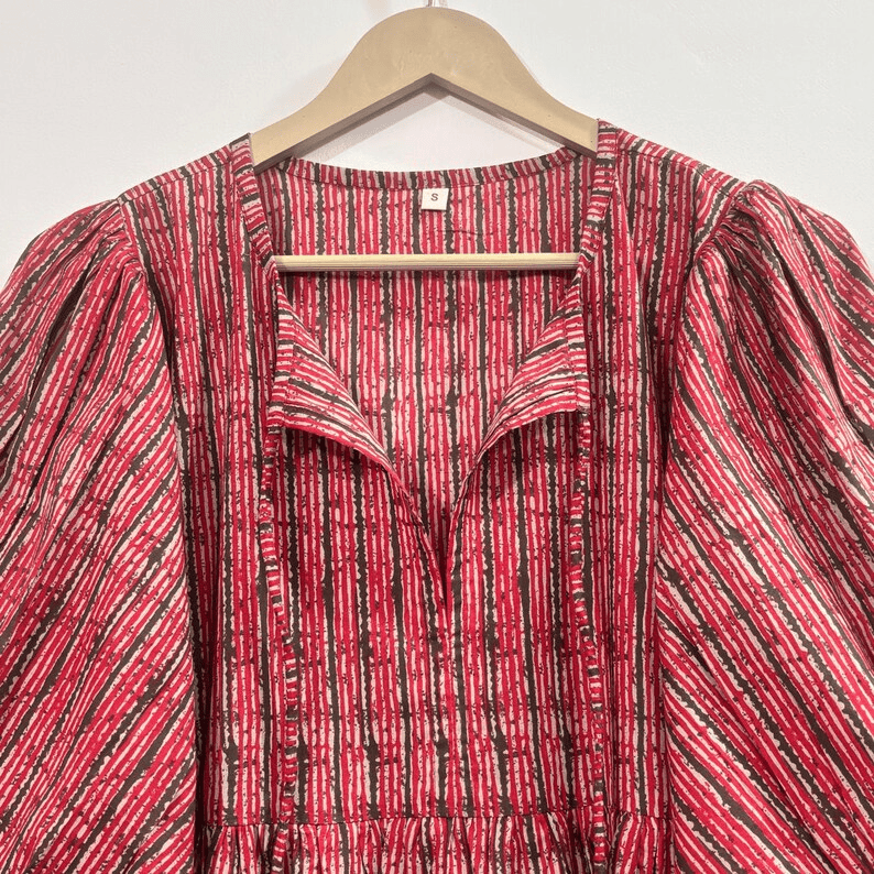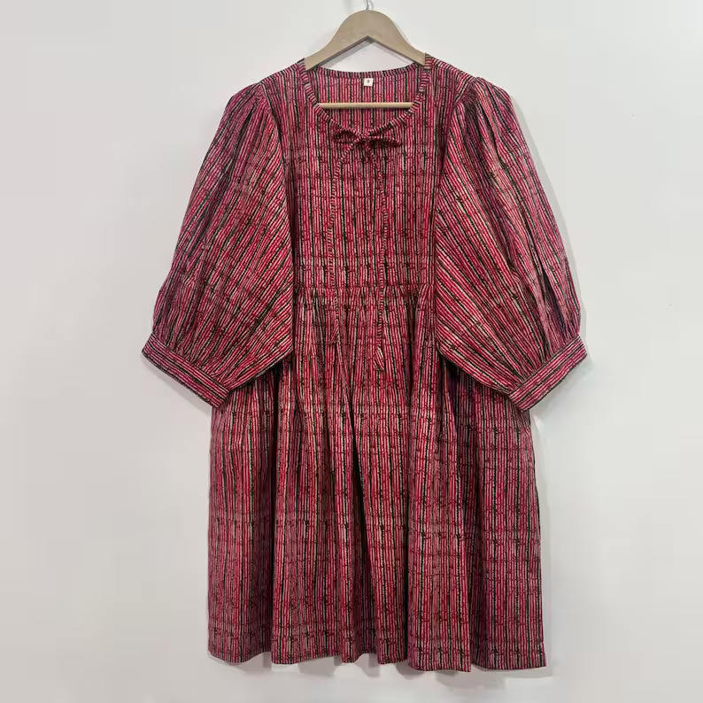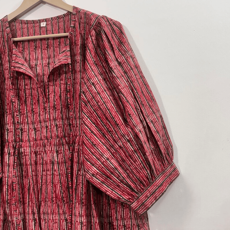 ลายพิมพ์ดอกไม้แบบแฮนด์บล็อก ทำด้วยมือ เป็นมิตรกับสิ่งแวดล้อม ผ้าฝ้าย 100% คอวี แขนสามส่วน แต่งระบายลูกไม้ ซักได้ ไม่ยับง่าย
