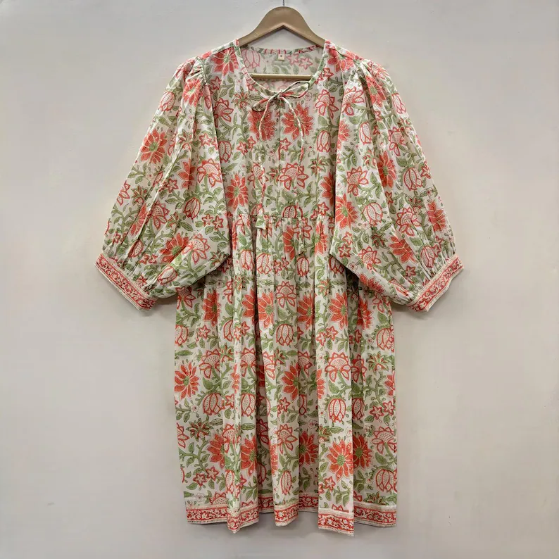 เดรสสั้นผ้าฝ้ายพิมพ์ลายดอกไม้แบบแฮนด์เมด คอวี แขนสามส่วน แต่งระบายลูกไม้ ซักได้ เป็นมิตรต่อสิ่งแวดล้อม สไตล์จีน