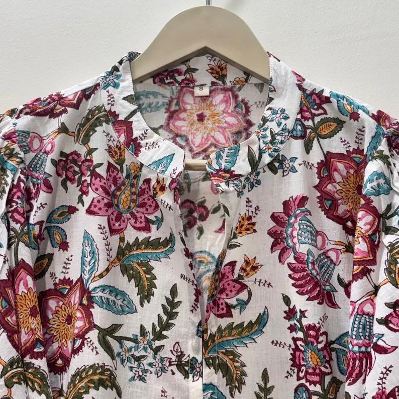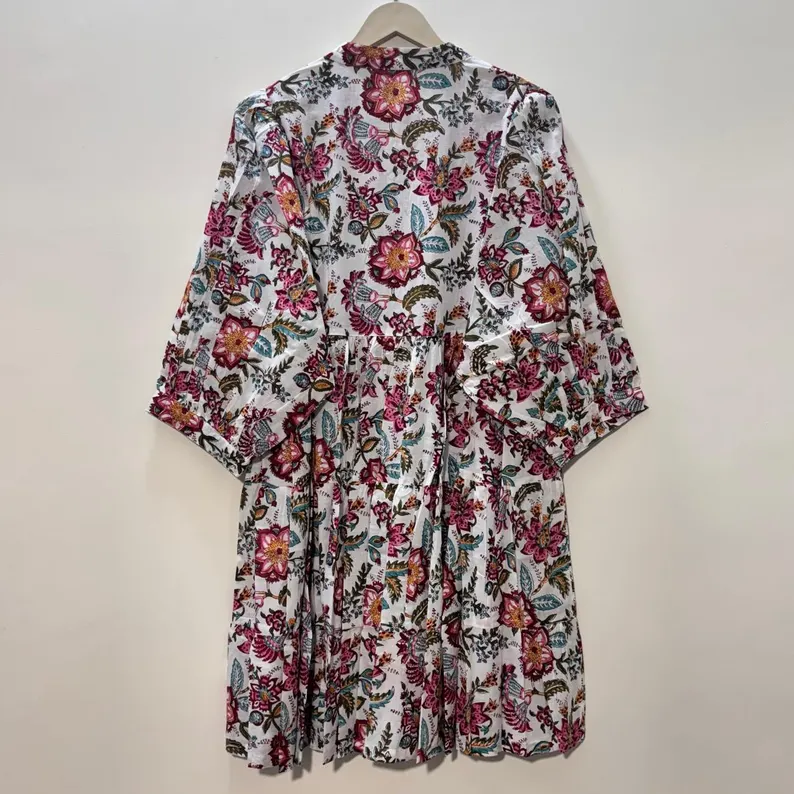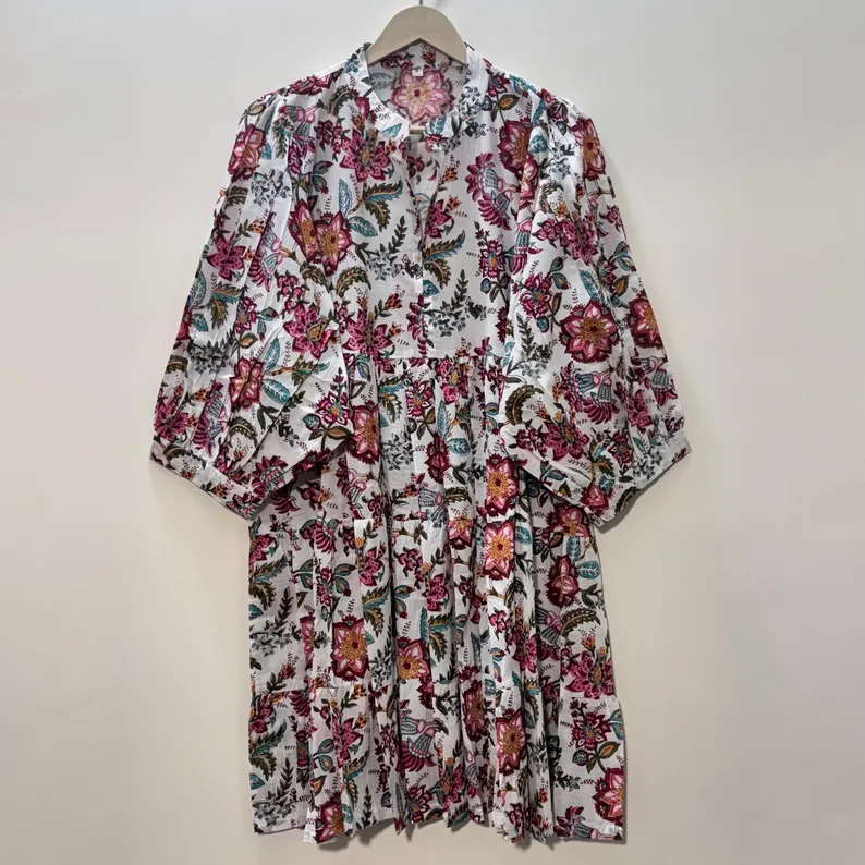 เดรสสั้นทรงทูนิค คอวี แขนสามส่วน แต่งระบายลูกไม้ ผ้าฝ้ายทำมือ พิมพ์ลายดอกไม้ด้วยเทคนิคบล็อกพิมพ์ เป็นมิตรต่อสิ่งแวดล้อม ซักได้ แบบเป็นทางการ