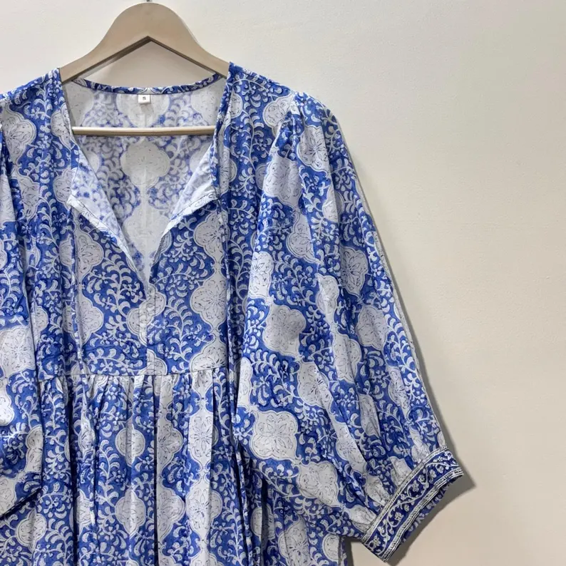 เสื้อผ้าฝ้ายพิมพ์ลายดอกไม้ด้วยมือ งานแฮนด์เมด เป็นมิตรกับสิ่งแวดล้อม คอวี แขนสามส่วน แต่งระบายลูกไม้ ซักได้ ทรงมินิ สไตล์ชิโนเซอรี