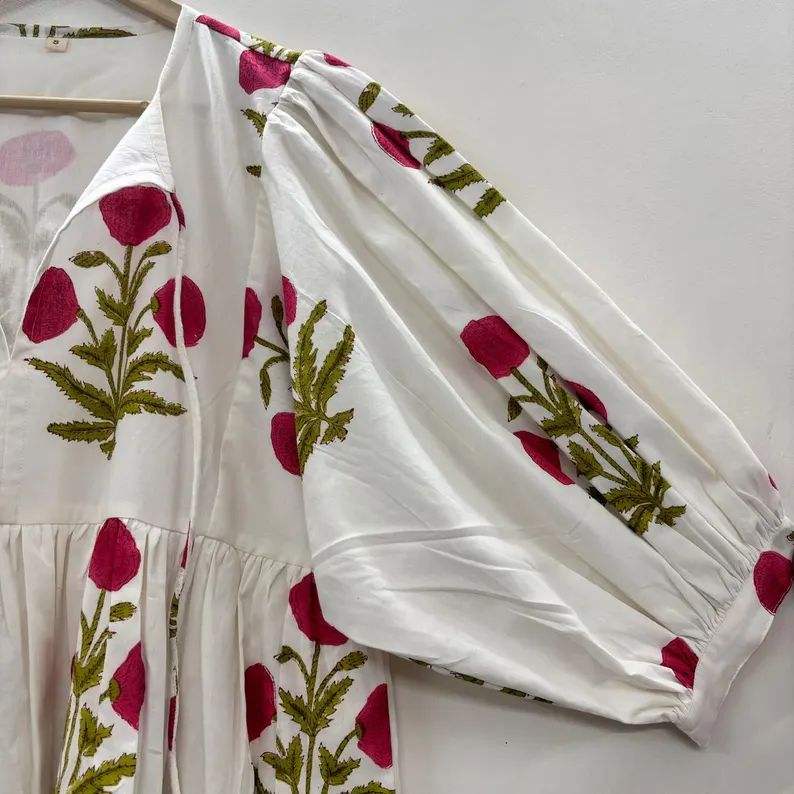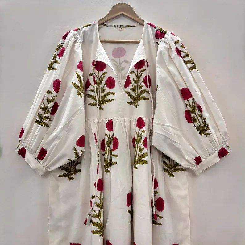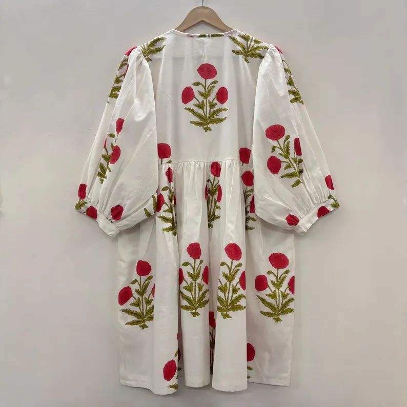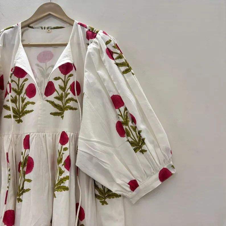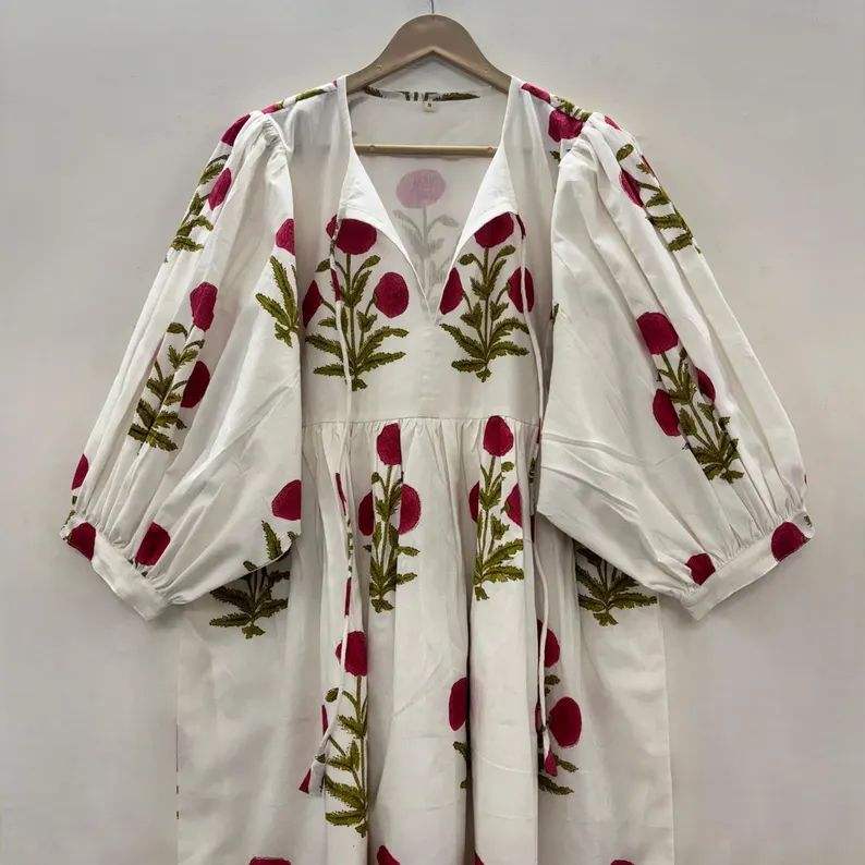 เดรสแขนกุดพิมพ์ลายดอกไม้สำหรับผู้หญิง, เดรสมิดิแขนสั้นผ้าฝ้ายโบฮีเมียน