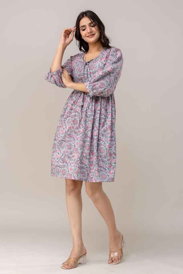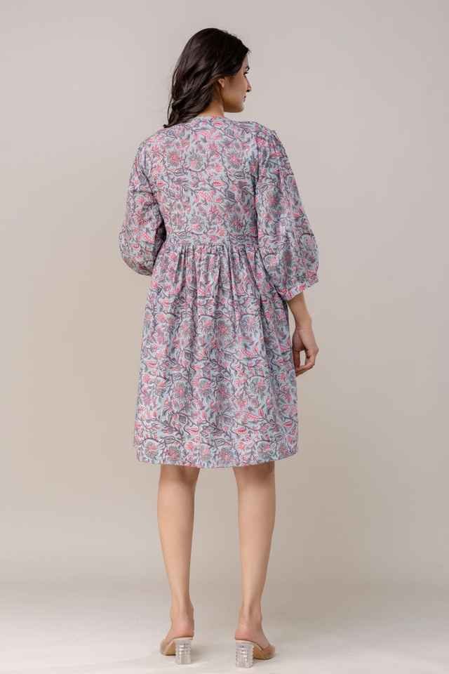 เดรสสั้นพิมพ์ลายดอกไม้แขนพองชุดเดรสผ้าฝ้ายอินเดียงานแฮนด์เมดชุดเดรส100แขนพองฤดูร้อน