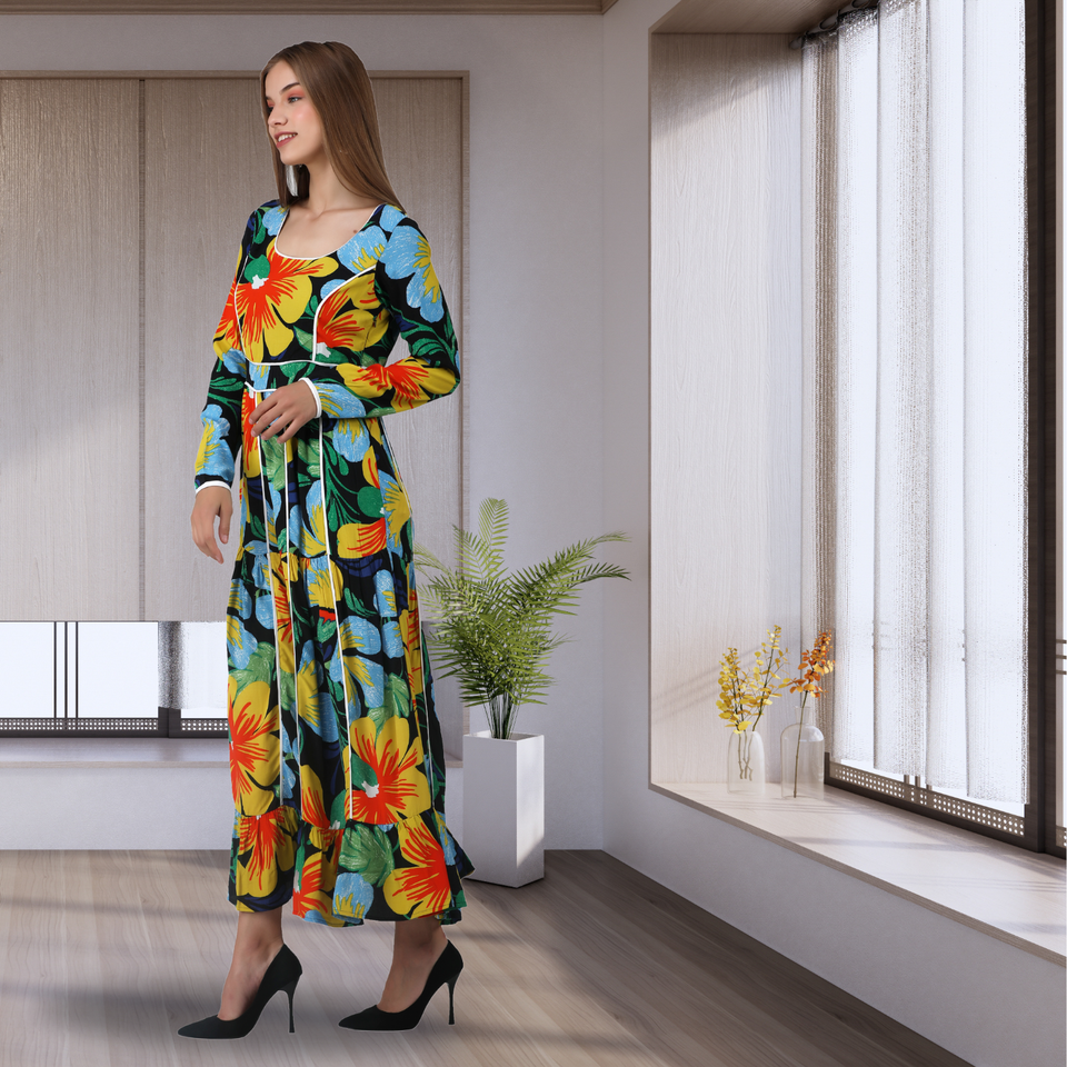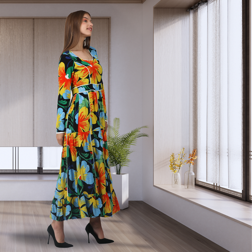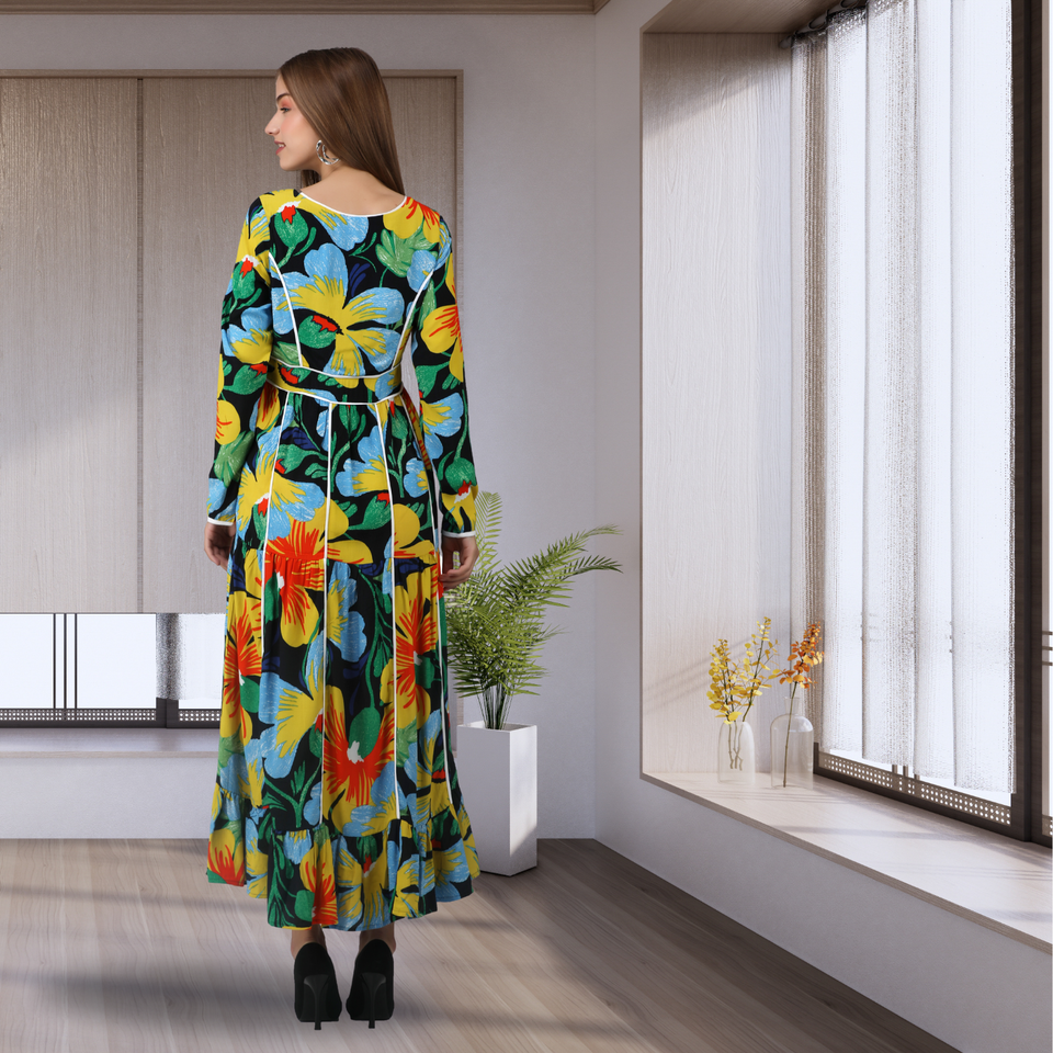 เดรสแม็กซี่ลายดอกไม้ทำมือสำหรับผู้หญิงแขนยาวพิมพ์ลายสดใสชุดเดรสใส่กลางวันแบบลำลองหรูหราสไตล์ปาร์ตี้อินเทรนด์มีสไตล์ธรรมชาติ