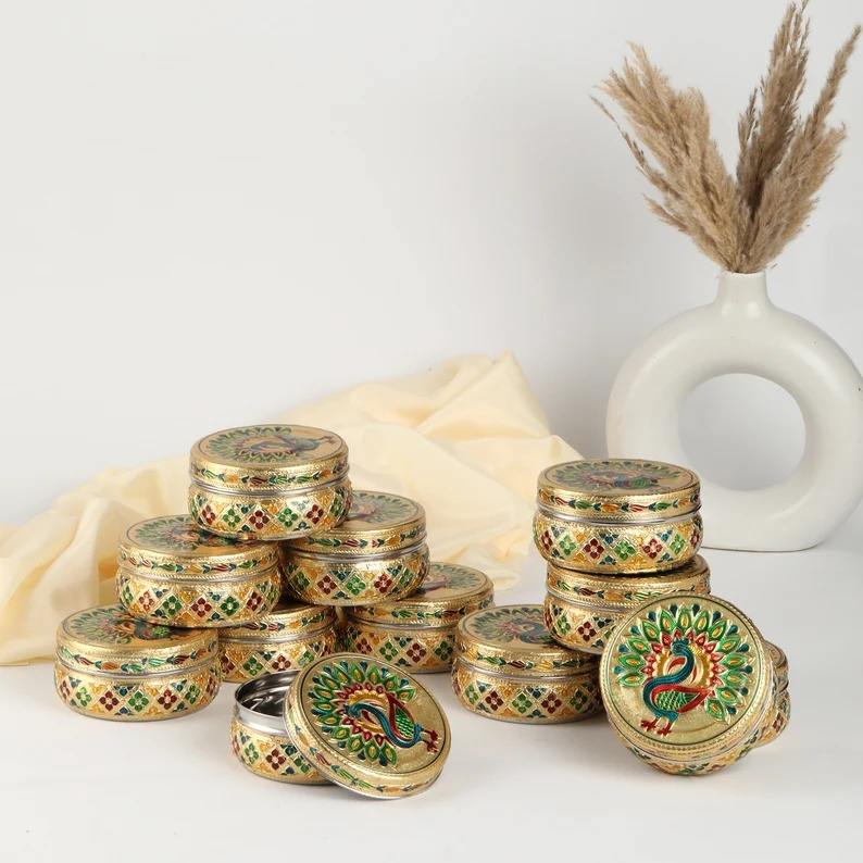 กล่องเหล็ก meenakari ลายดอกไม้สไตล์อินเดียสำหรับงานแต่งงานแบบดั้งเดิมภาชนะบรรจุแสนหวานชุดของขวัญสำหรับปาร์ตี้