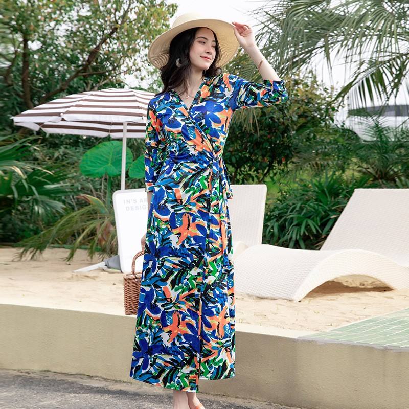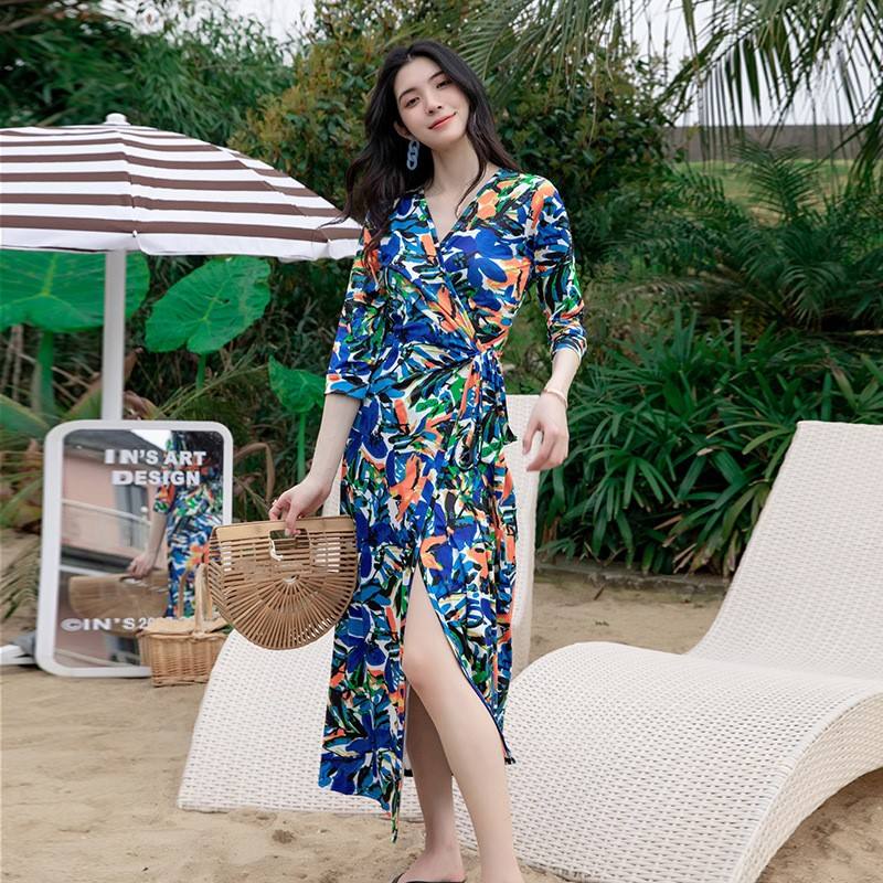 ชุดเดรสชายหาดผู้หญิงแฟชั่นใหม่ลายดอกไม้ชุดคลุมลำลองชุดชายหาดชุดเดรสแบบผูกเอวเสื้อคลุมเซ็กซี่สำหรับฤดูใบไม้ผลิฤดูร้อน