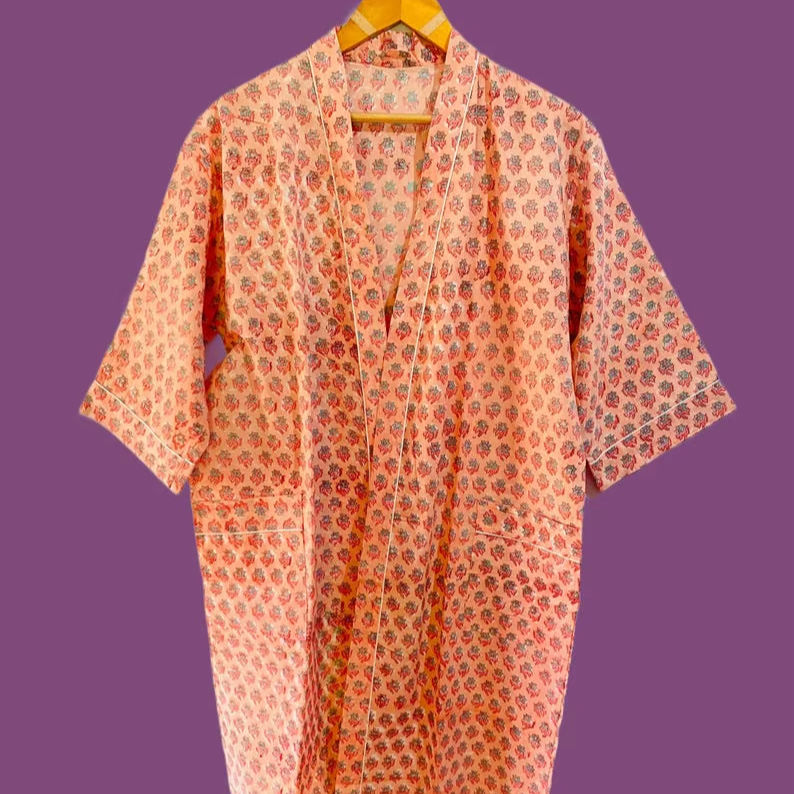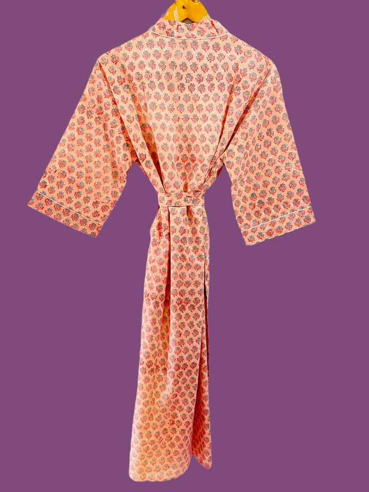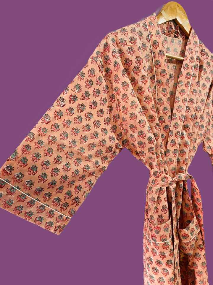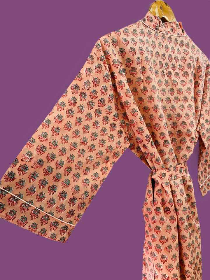 ชุดกิโมโนผ้าฝ้ายลายดอกพีชพร้อมเข็มขัดลายทาง ชุดคลุมอาบน้ำสปา ชุดลำลองน้ำหนักเบา