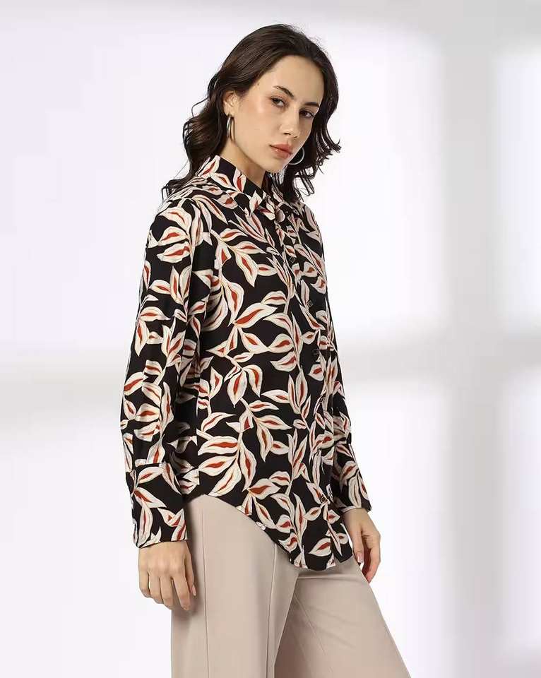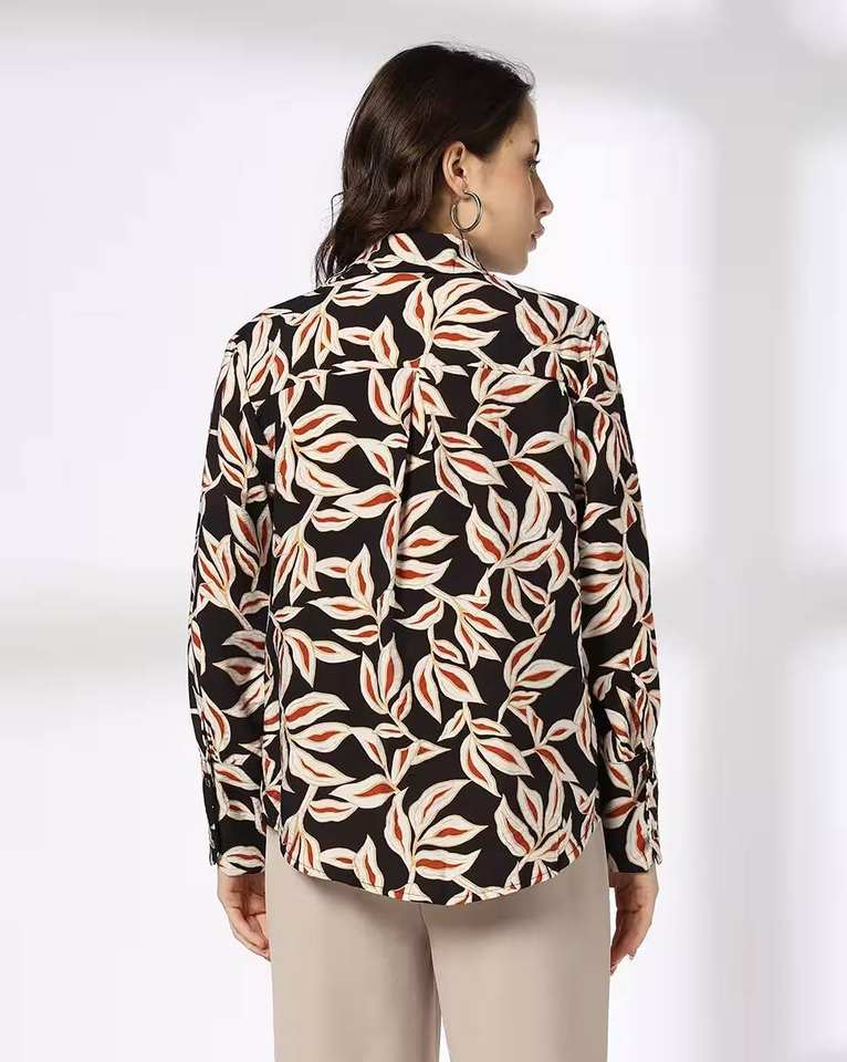 เสื้อเชิ้ตผู้หญิงลำลองปกสองชั้นติดกระดุมลายดอกไม้สีดำสีขาว