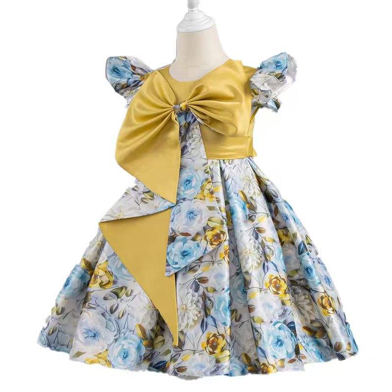 ชุดเดรสพิมพ์ลายดอกไม้พร้อมโบว์ผ้าซาตินแขนระบายสำหรับเด็กผู้หญิงชุดเจ้าหญิงกระโปรงพองๆปาร์ตี้งานแต่งงานสำหรับเด็ก