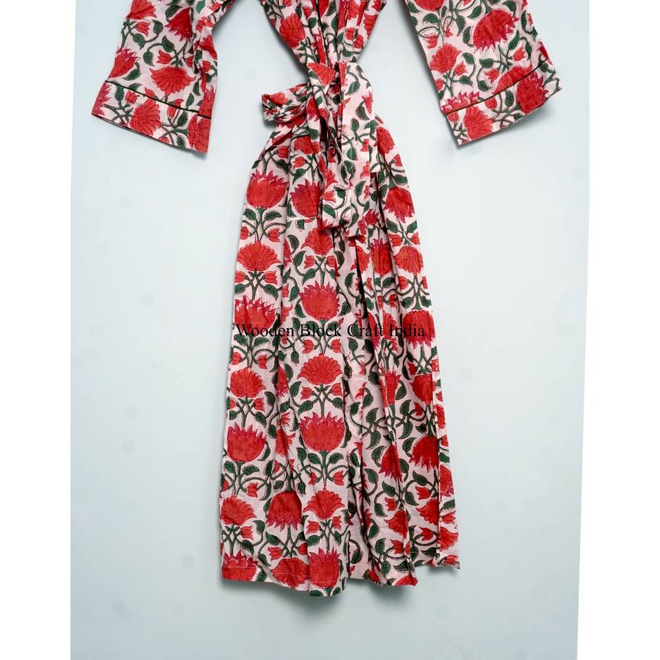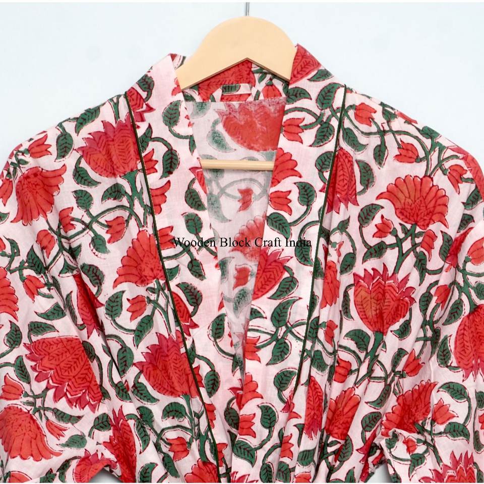 ชุดคลุมกิโมโนผ้าฝ้ายอินเดียพิมพ์ลายดอกไม้แบบแฮนด์บล็อกพิมพ์ ชุดคลุมยาวสำหรับเพื่อนเจ้าสาว ชุดคลุมอาบน้ำสำหรับฤดูร้อน