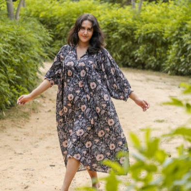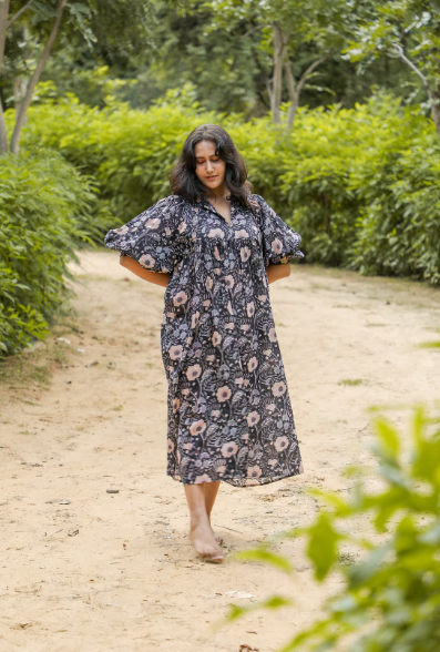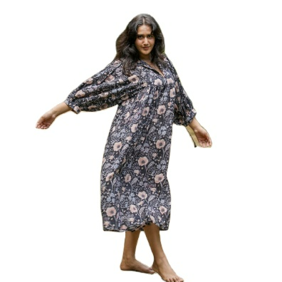 เดรสแม็กซี่ยาวถึงเข่าพิมพ์ลายดอกไม้แฟชั่นแขนสามส่วนคอวี