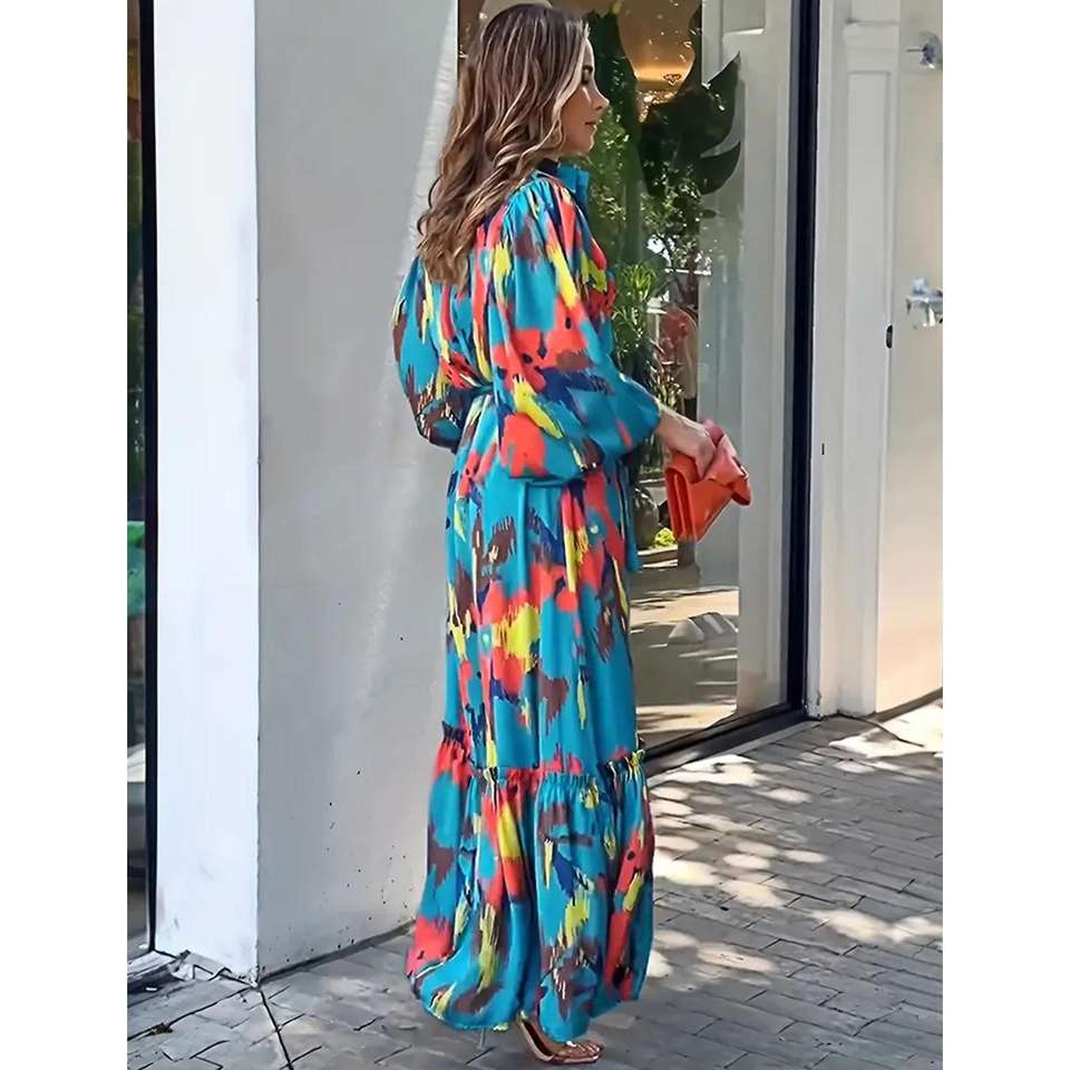 Floral Print Maxi Dress for Women-Autumn Fashionable Elegant Chic Bishop Sleeve Long Sleeve Zipper Decoration Stylish Stylish