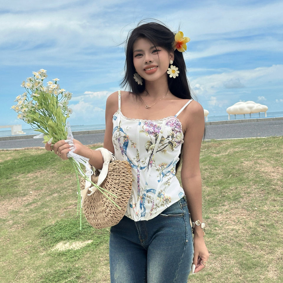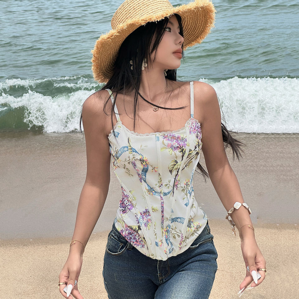เสื้อกล้ามสายเดี่ยวพิมพ์ลายดอกไม้สำหรับผู้หญิง ทรงเข้ารูป กระชับเอว น้ำหนักเบา เหมาะสำหรับฤดูร้อน ชายหาด และวันหยุด