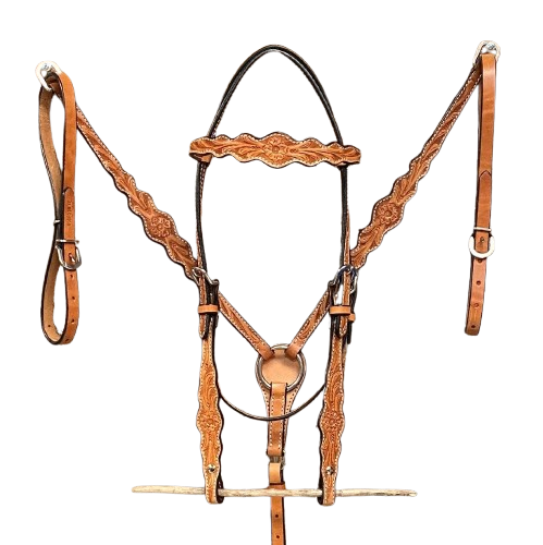 ชุดอุปกรณ์ขี่ม้าแบบตะวันตก หนังเคลือบน้ำมันลายดอกไม้ พร้อมสายรัดอกและบังเหียน มีทุกขนาด