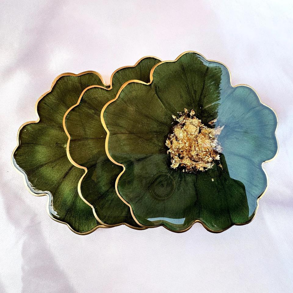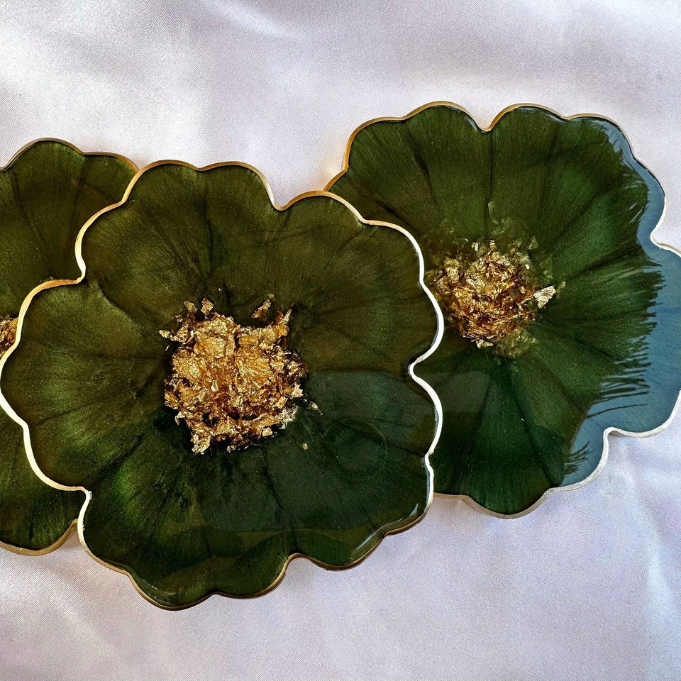 ที่รองแก้วเรซิ่นรูปทรงดอกไม้สีเขียว ประดับด้วยลายทอง สำหรับโต๊ะกาแฟ โต๊ะอาหาร ของตกแต่งบ้าน และของขวัญจากอินเดีย