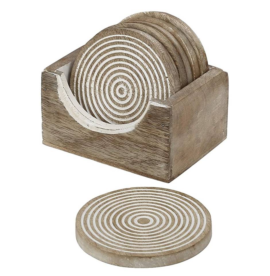 ที่รองแก้วกาแฟและชาลายดอกไม้สำหรับใช้ในบ้านบนกล่องงานฝีมือไม้หรือป้ายติดผนัง
