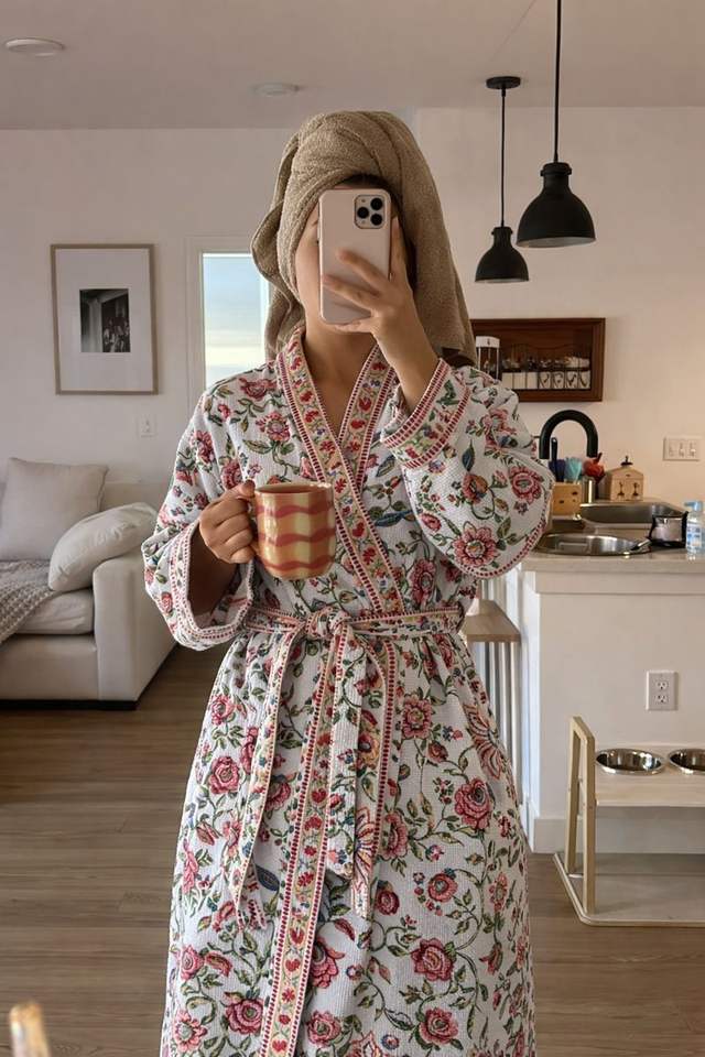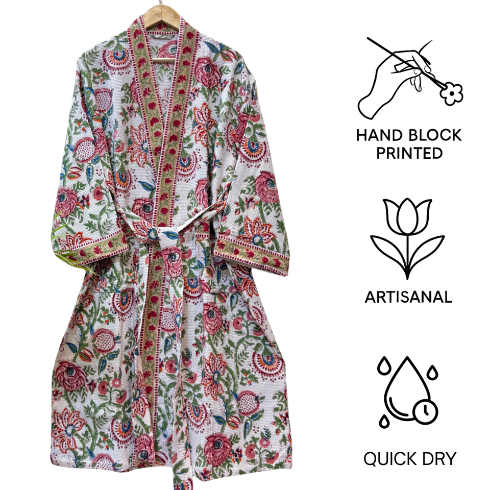 เสื้อคลุมอาบน้ำผ้าฝ้ายลายดอกวาฟเฟิล พิมพ์ลายด้วยมือ สำหรับโรงแรม สปา คิโมโน น้ำหนักเบา แห้งเร็ว บีบอัดได้ เป็นมิตรกับสิ่งแวดล้อม ผลิตตามสั่ง