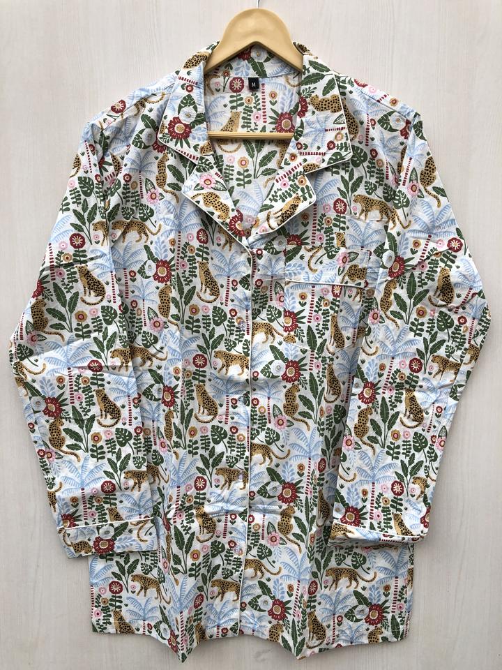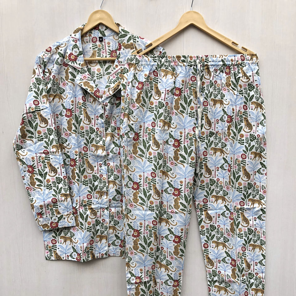 ชุดนอนผ้าฝ้ายลายดอกไม้ ชุดนอนผ้าฝ้ายทำมือ ชุดนอนอินเดียลายดอกไม้พิมพ์ลายด้วยมือ ชุดนอนผ้าฝ้าย