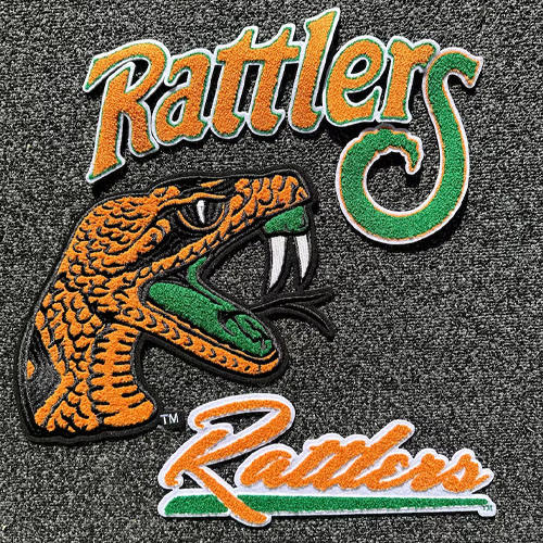 ตราสัญลักษณ์รัตเทิลเลอร์ มหาวิทยาลัยฟลอริดา เอ็มแอนด์เอ็ม (FAMU) แบบปักด้วยไหมเชนิลล์ รูปทรงดอกไม้ 3 มิติ ประดับด้วยลูกปัด ผ้าพีวีซีทอ แบบรีดติด