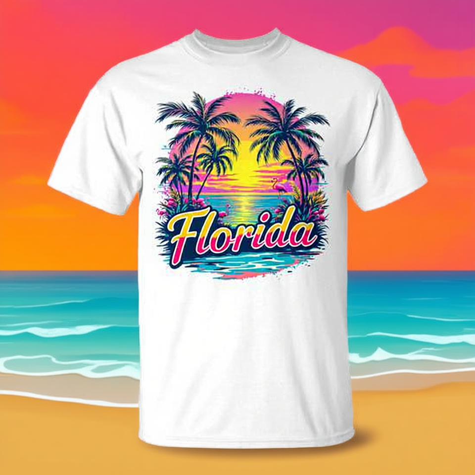 เสื้อยืดลายต้นปาล์มพระอาทิตย์ตกฟลอริด้า ดีไซน์วินเทจย้อนยุค สำหรับผู้ใหญ่ทั้งชายและหญิง