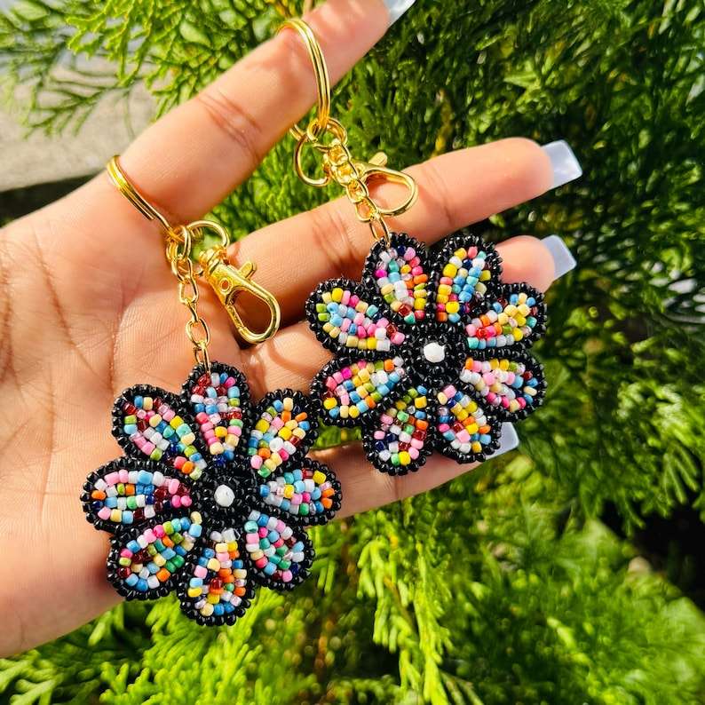 พวงกุญแจปักลูกปัดดอกไม้: พวงกุญแจดอกชบาทำมือ ของตกแต่งกระเป๋า พวงกุญแจรถ ลูกปัดเม็ดเล็ก