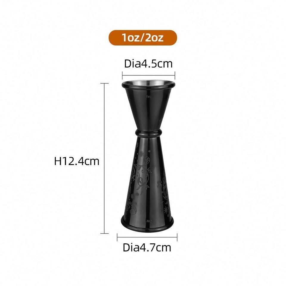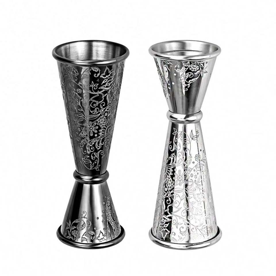 แก้วตวงค็อกเทลแบบสองด้าน สไตล์ญี่ปุ่น ทำจากสแตนเลส SS304 ขนาด 1+2 ออนซ์ ลายสลักดอกไม้ พร้อมเลเซอร์มาร์กกิ้ง เหมาะสำหรับบาร์เทนเดอร์