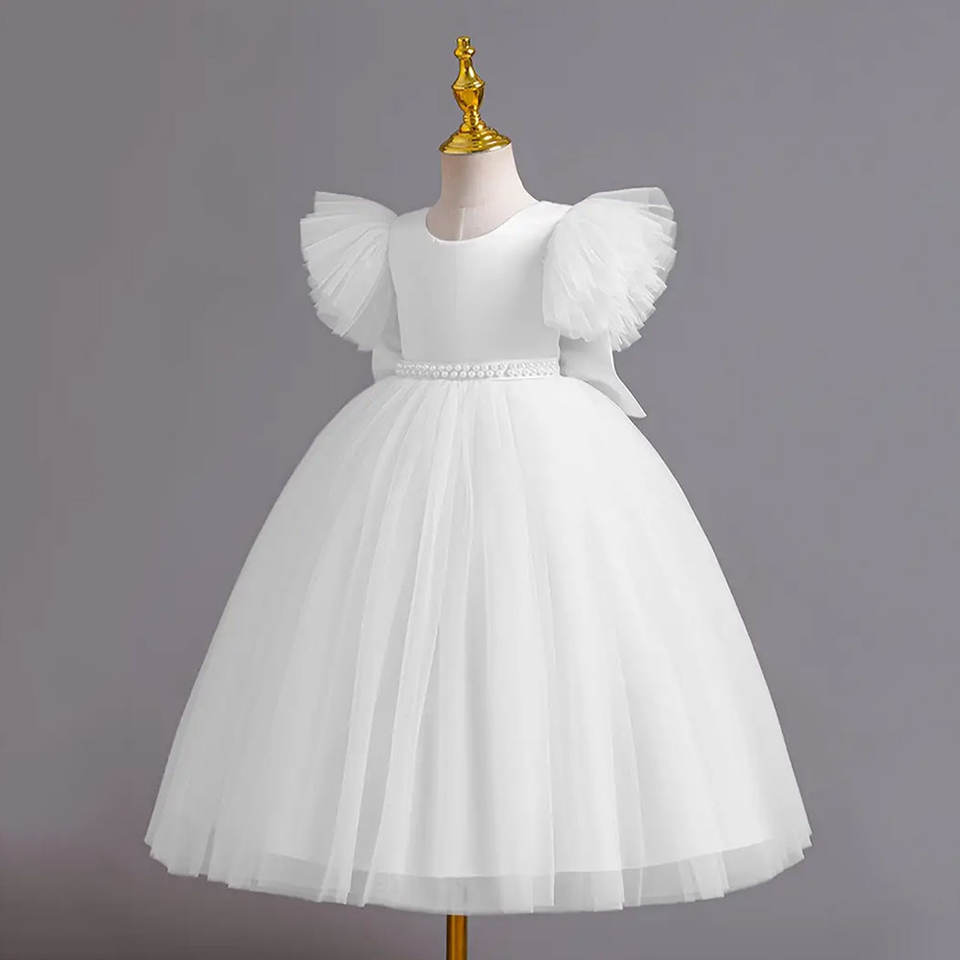 ชุดเดรสเด็กผู้หญิงพร้อมแขนเสื้อปีกนางฟ้า เสื้อผ้าเด็ก สายคาดเอวประดับมุกและกระโปรงผ้าทูลหลายชั้น