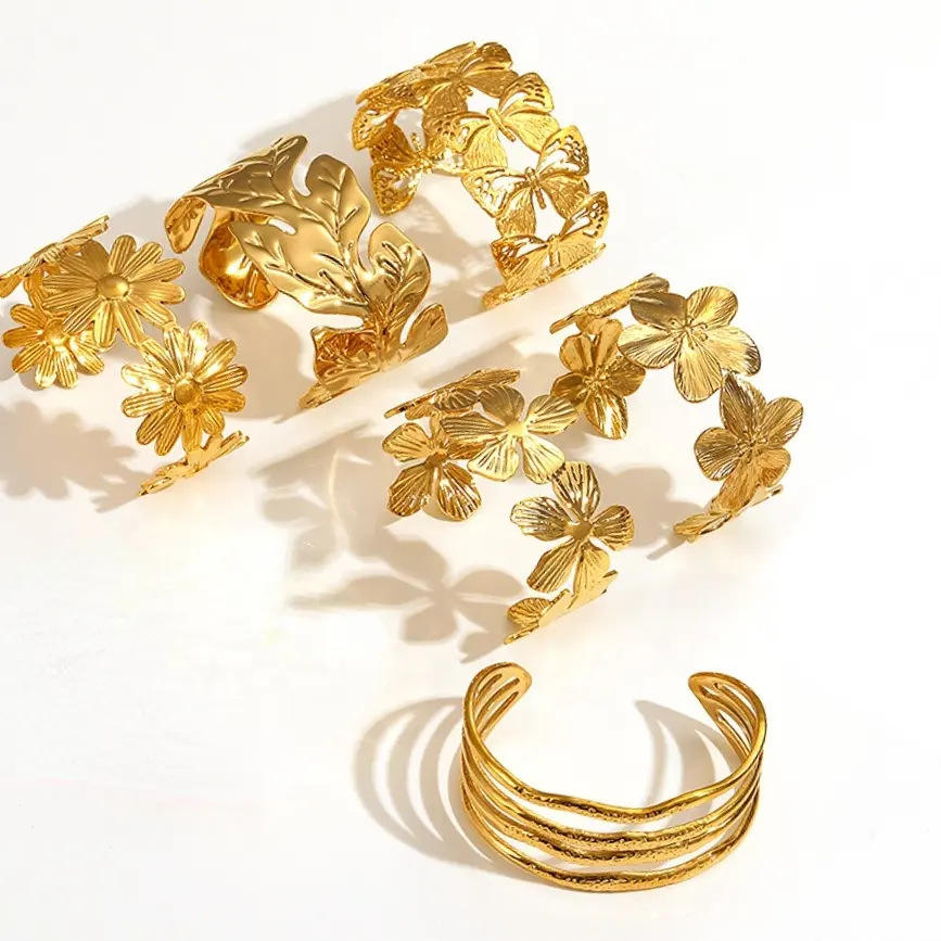 กำไลข้อมือแบบเปิดปรับได้ลายดอกไม้ สแตนเลสสตีล ดีไซน์โปร่ง เครื่องประดับสำหรับทุกเพศ