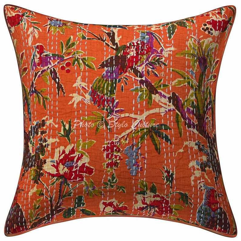Flower Print Kantha Cushion Cover Indian Decorative Home Decor Handmade Thread Work Custom Sofa Cushion Covers