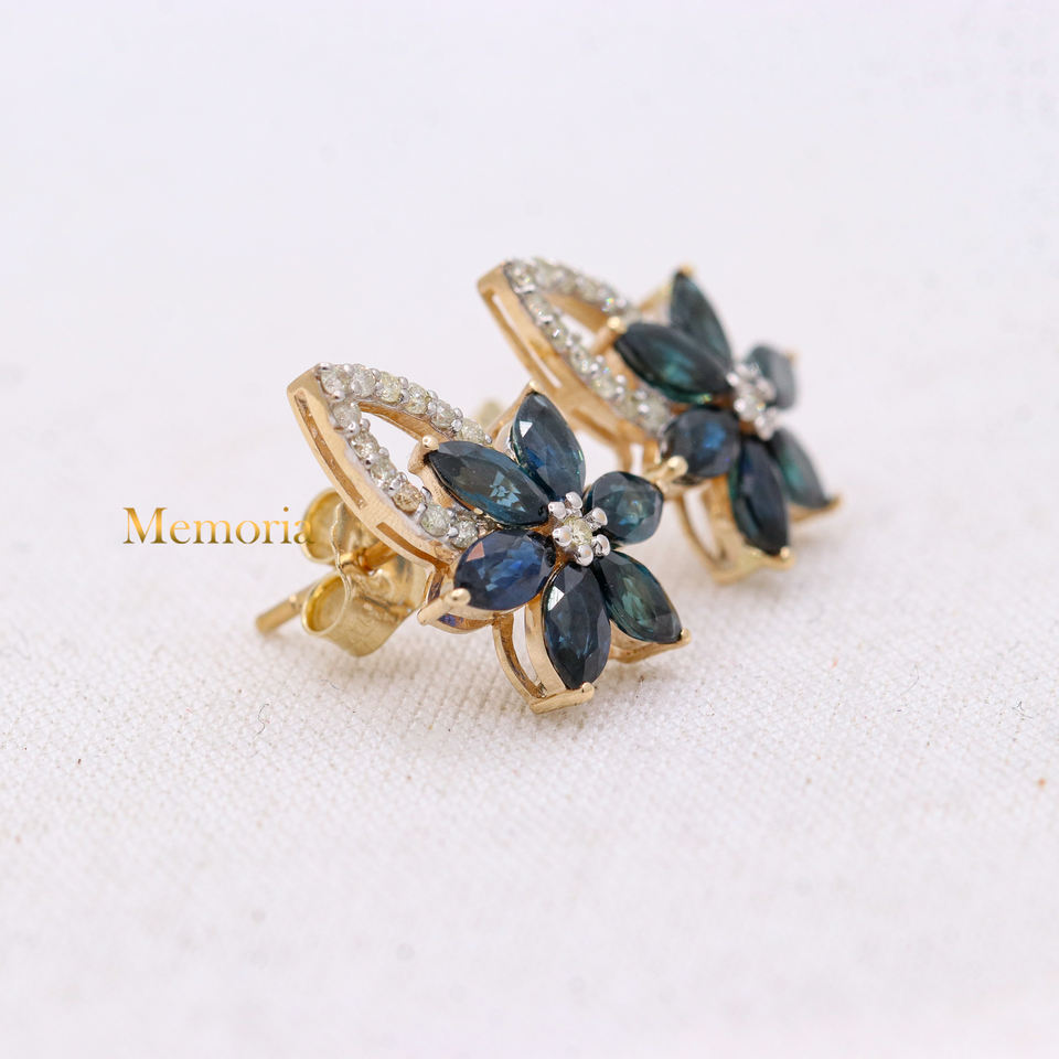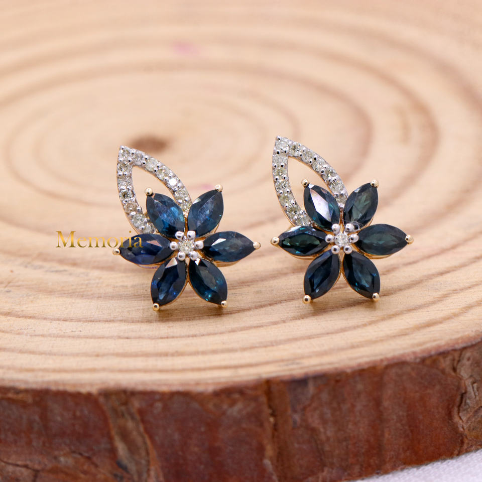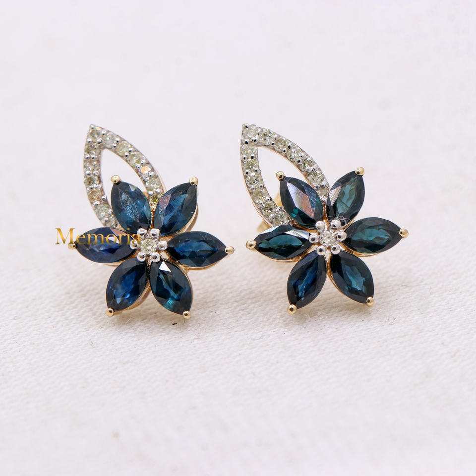 ต่างหูเพชรแซฟไฟร์และเพชรสีฟ้าล้ำค่าทรงดอกไม้ทำด้วยมือและทอง14K ทำด้วยมือสำหรับผู้หญิงขายส่ง