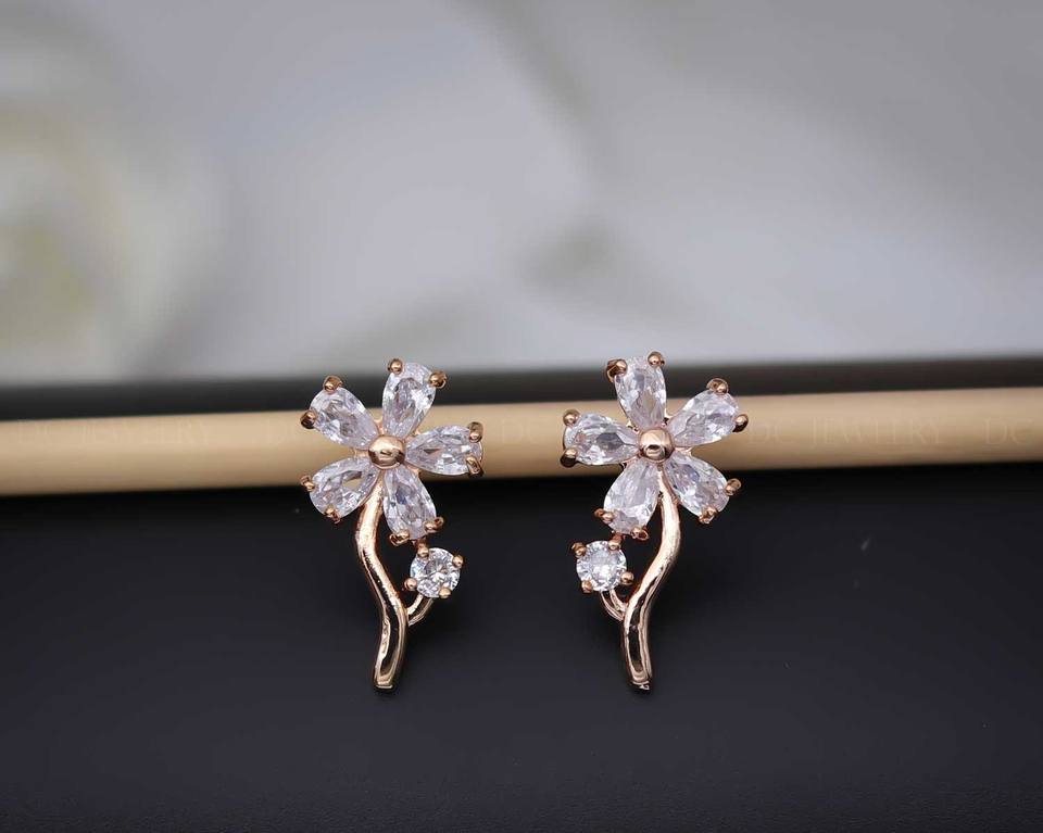 ต่างหูสแตนเลสทรงดอกไม้ดีไซน์เก๋พร้อมก้านประดับเพชรซิร์คอน (AD) แบบติดหู
