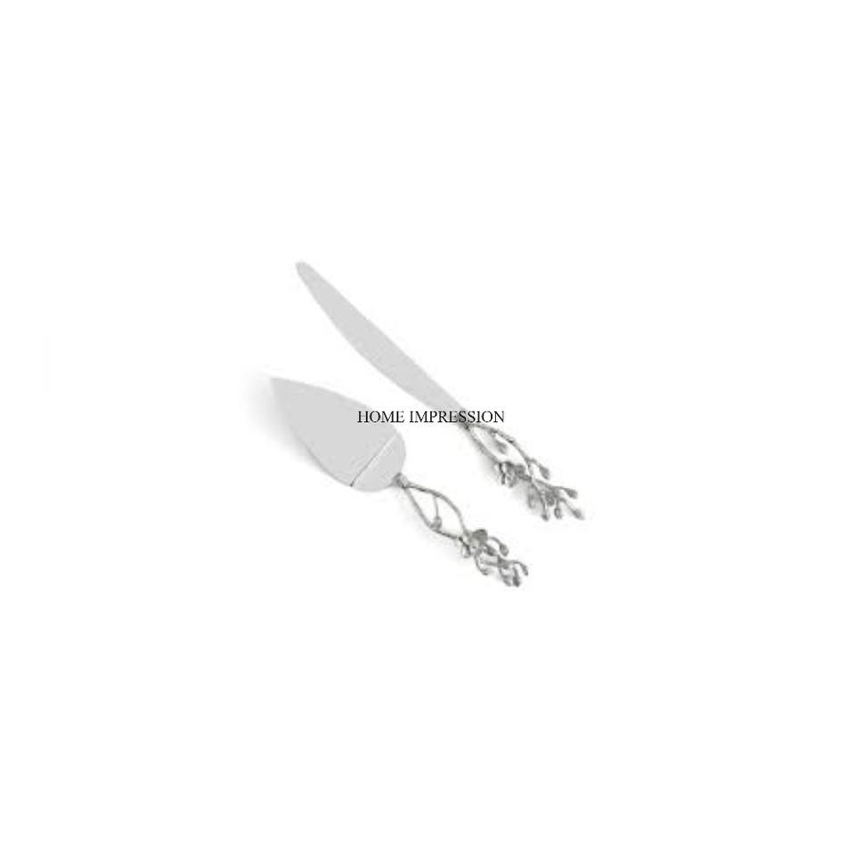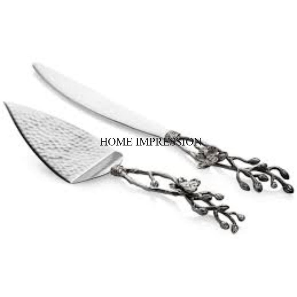 ที่ตัดเค้กโลหะคุณภาพเยี่ยม สีเงิน เงาเหมือนกระจก ดีไซน์ลายดอกไม้และใบไม้ ปลอดสารพิษ เป็นมิตรกับสิ่งแวดล้อม ผลิตในอินเดีย