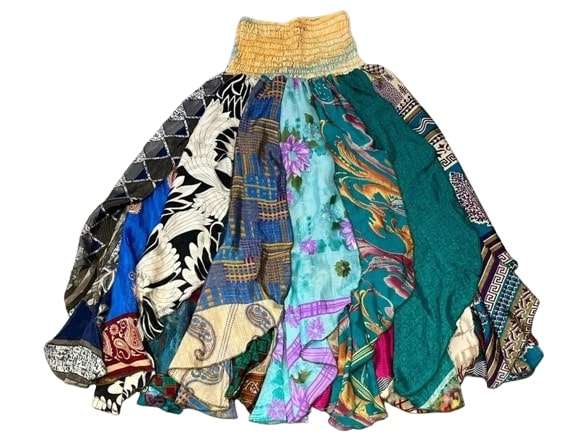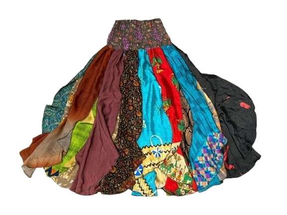 Flowy Patchwork Skirt Summer Bohemian Long Maxi Recycled Sari Silk Scrap Skirt Hippie Boho Festival Skirt 70s Retro