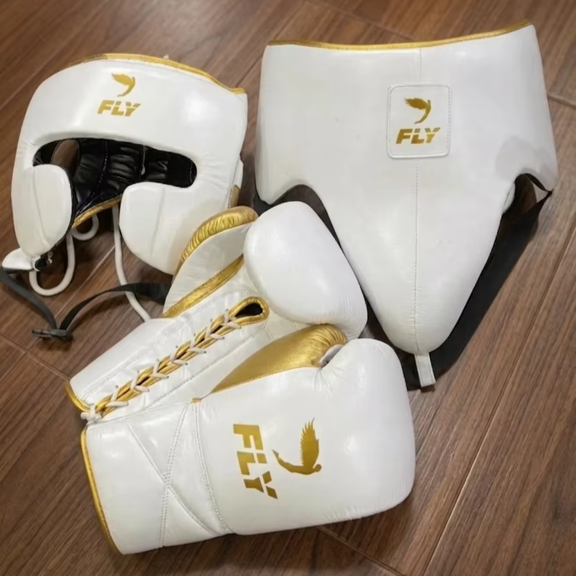 ชุดนวมชกมวย MMA Fly Superlace หนังแท้สั่งทำพิเศษ กันลื่น ระบายอากาศได้ดี พร้อมอุปกรณ์ป้องกันศีรษะแบบเต็มนิ้ว อุปกรณ์ป้องกันอวัยวะเพศชาย และอุปกรณ์ป้องกันขาหนีบ