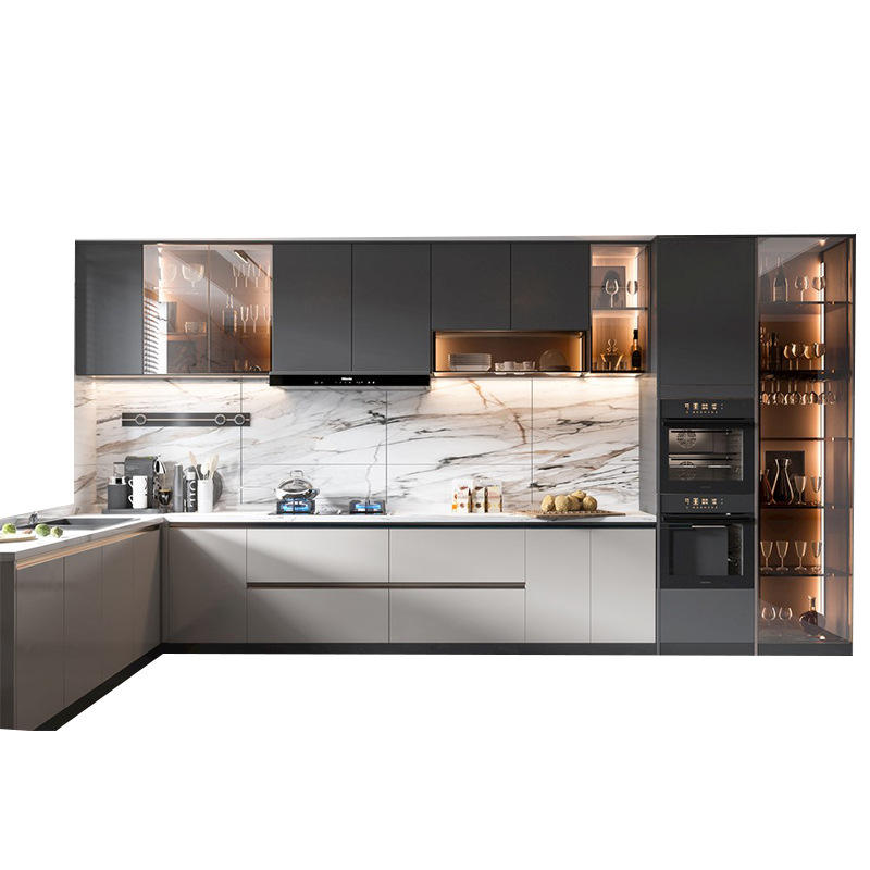 ชุดตู้ครัวไม้สไตล์โมเดิร์นแบบกำหนดเอง พร้อมชุดอุปกรณ์อัตโนมัติ ขนาด ขนาดสี และฮาร์ดแวร์ที่กำหนดเองได้ รองรับ OEM/ODM