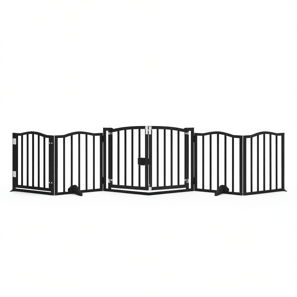 ประตูกั้นสุนัขแบบพับได้ 6 แผง ขนาด 118.1 นิ้ว สีดำ ทำจากไม้ป็อปลาร์ สำหรับสัตว์เลี้ยง ใช้ภายในบ้าน สไตล์โมเดิร์น ปิดแบบผลักขึ้น