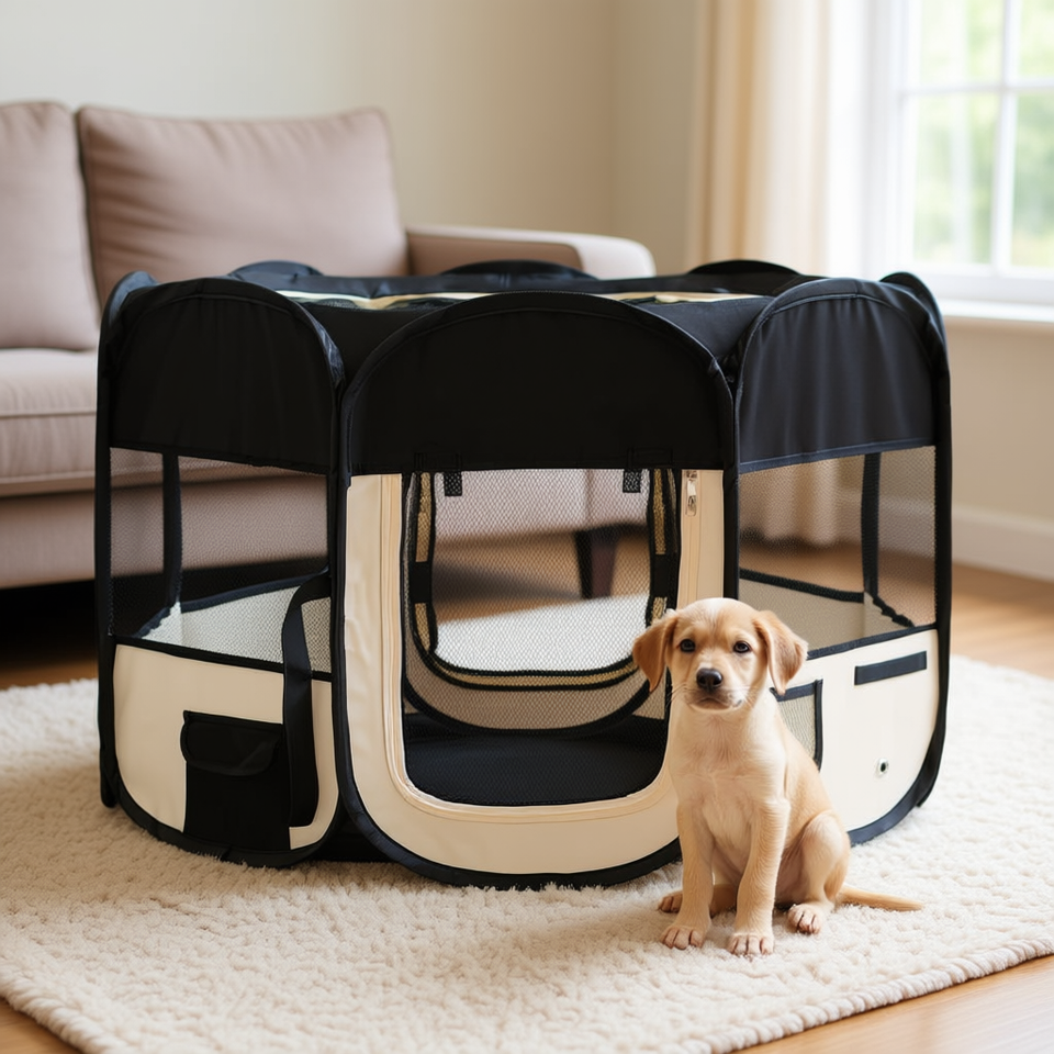 คอกกั้นสุนัขแบบพับได้ สีดำครีม โพลีเอสเตอร์ โครงเหล็ก ขนาดกลาง สำหรับความบันเทิงของสุนัข