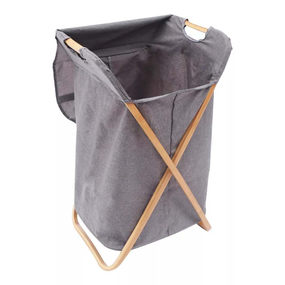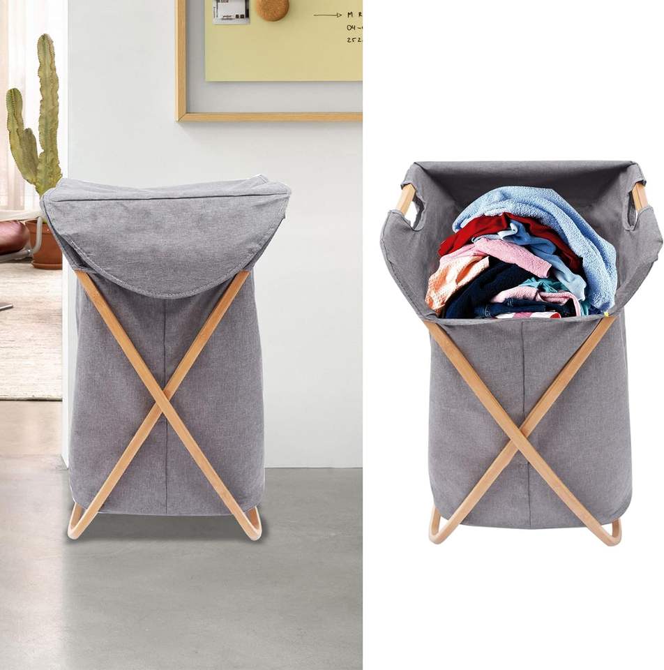 ตะกร้าผ้าพับได้พร้อมโครงไม้ไผ่ ถุงใส่ผ้าสกปรกแบบพับเก็บได้พร้อมฝาปิด