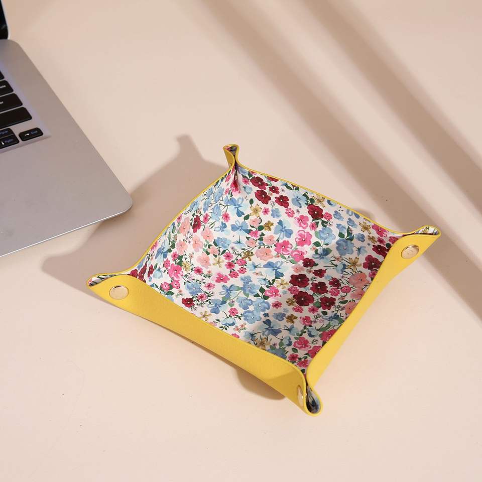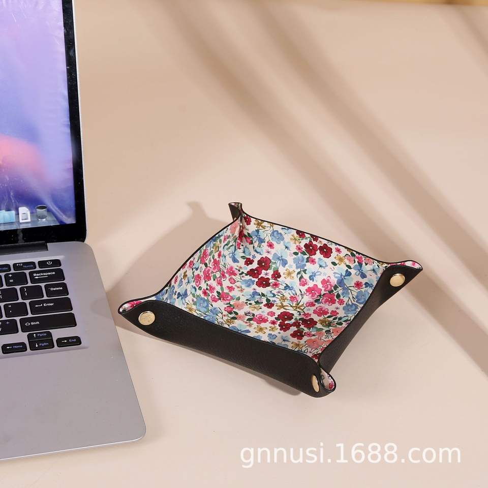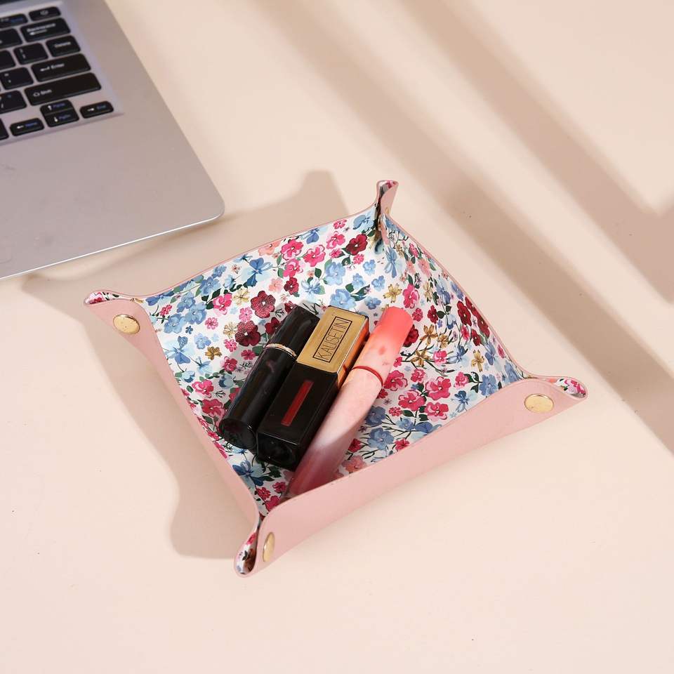 กล่องเก็บของตั้งโต๊ะหนัง PU แบบพับได้ทรงสี่เหลี่ยมพร้อมลายดอกไม้สีชมพูสำหรับแต่งหน้าและกุญแจ