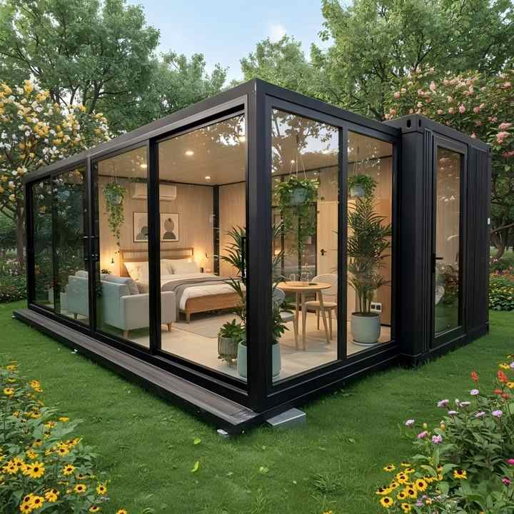 บ้านสำเร็จรูปคอนเทนเนอร์ขนาด 20 ฟุต แบบพับเก็บได้เพื่อการขนส่ง พร้อมลิ้นชักเลื่อนออกได้ ขยายได้ด้วยปีกเดี่ยว และกระจกตกแต่ง