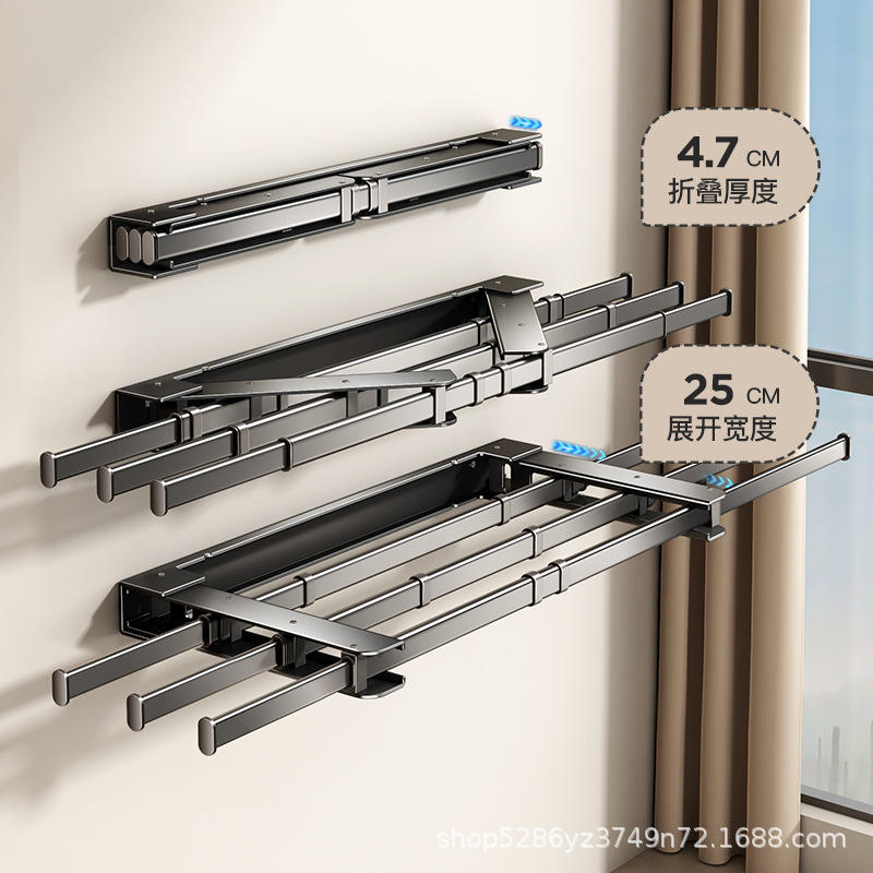 ราวแขวนผ้าแบบพับได้สามราวติดผนัง ประหยัดพื้นที่ สำหรับระเบียงหรือใช้ในบ้านโดยไม่ต้องเจาะ