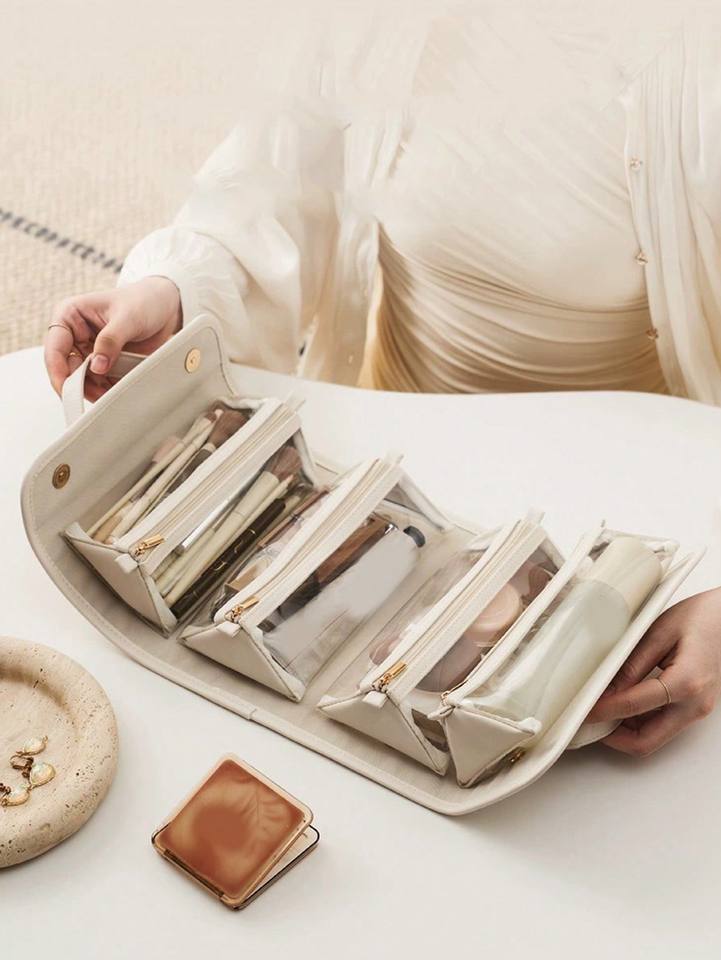 กระเป๋าเครื่องสำอางผู้หญิงแบบพับได้ PU แบบพกพาความจุขนาดกลาง 4-in-1 สำหรับเดินทางกันน้ำได้พรีเมี่ยมสำหรับชุดด็อปป์คิท