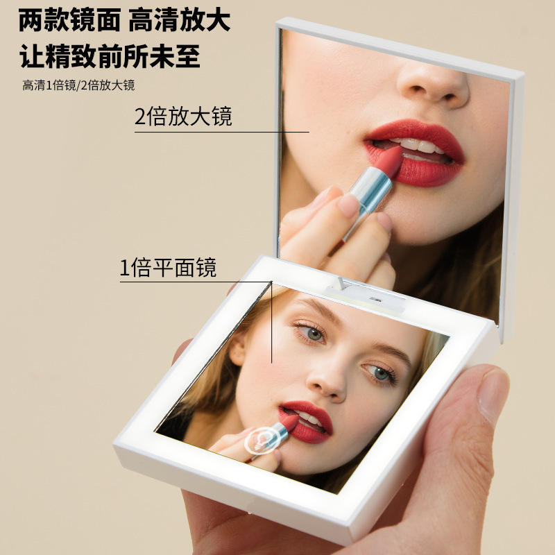 กระจกแต่งหน้าแบบพับได้ กระจกแต่งหน้าแบบมีไฟ LED สองด้านพร้อมกำลังขยาย 1 เท่าและ 2 เท่าเพื่อการแต่งหน้าที่แม่นยำ