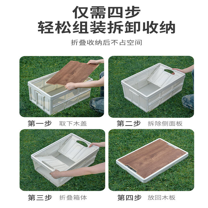 กล่องเก็บของแบบพับได้พร้อมฝาไม้ โต๊ะกลางแจ้งทรงสี่เหลี่ยม ทนแรงกด กล่องจัดระเบียบสำหรับตั้งแคมป์แบบพับได้