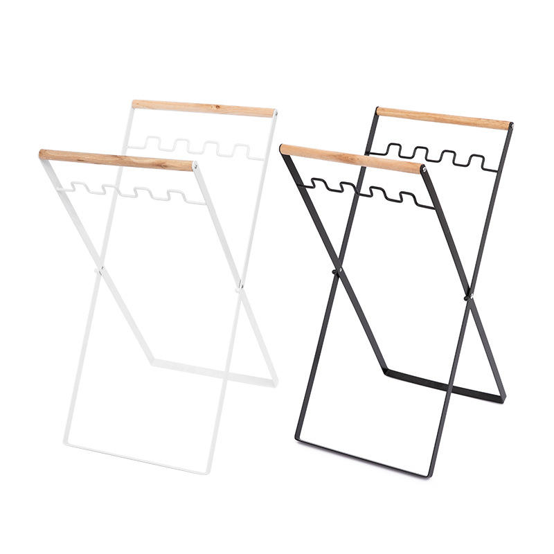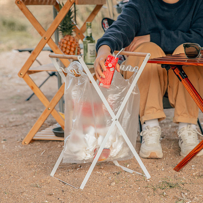 ชั้นวางขยะแบบพับได้พร้อมที่จับไม้ทรงสี่เหลี่ยมผืนผ้าแบบตั้งพื้น อุปกรณ์จัดเก็บแบบพกพาสำหรับการตั้งแคมป์ใช้ในบ้าน สีดำและสีขาว