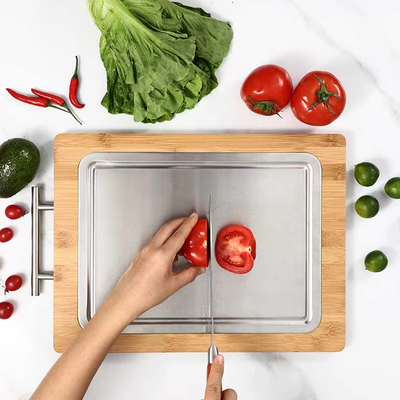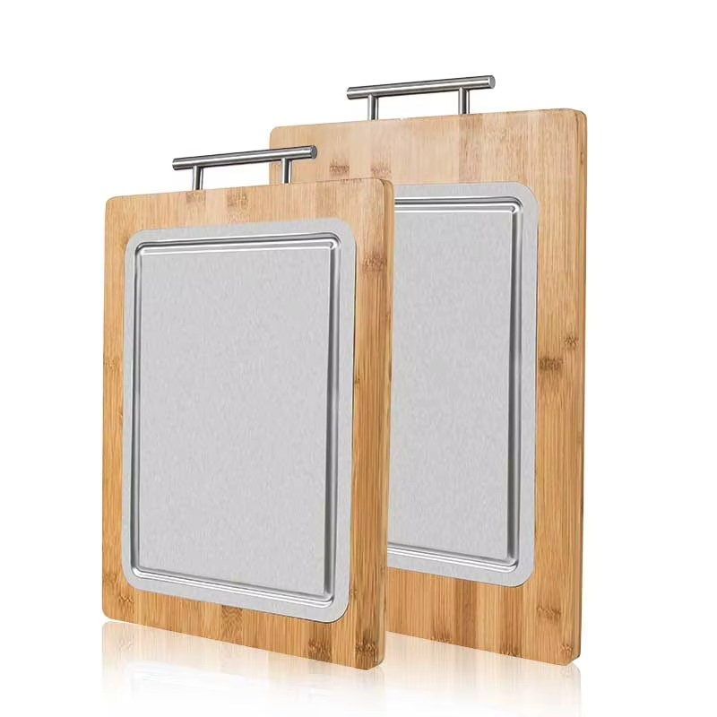 Food Grade Cake Wooden Bamboo 304 Stainless Steel Charcuterie Serving Cutting Board Double Sided For Kitchen With Juice Groove