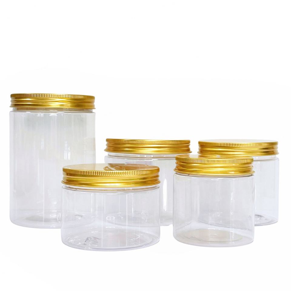 ขวดพลาสติกใสเกรดอาหารสำหรับเก็บของ ขนาด 2 ออนซ์ 4 ออนซ์ 8 ออนซ์ 12 ออนซ์ 16 ออนซ์ ขวดพลาสติก PET สำหรับเครื่องสำอาง ฝาอลูมิเนียมสีทอง