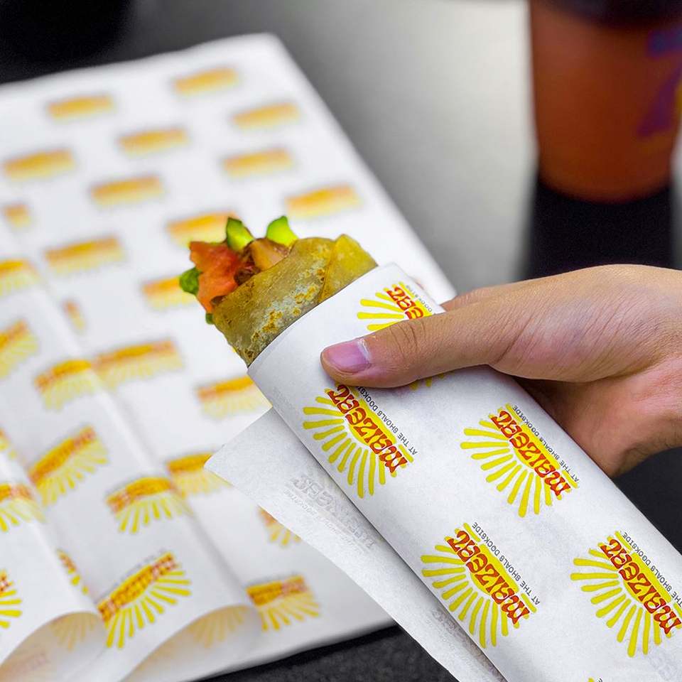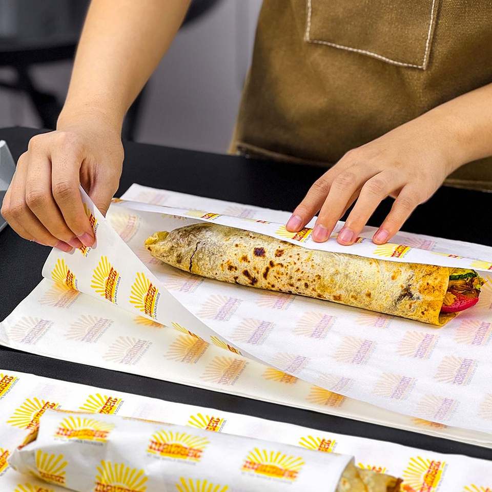 กระดาษห่ออาหารกันน้ำมัน พิมพ์โลโก้ตามสั่ง เกรดอาหาร สำหรับห่อไก่โรล เบอร์เกอร์ แซนวิช