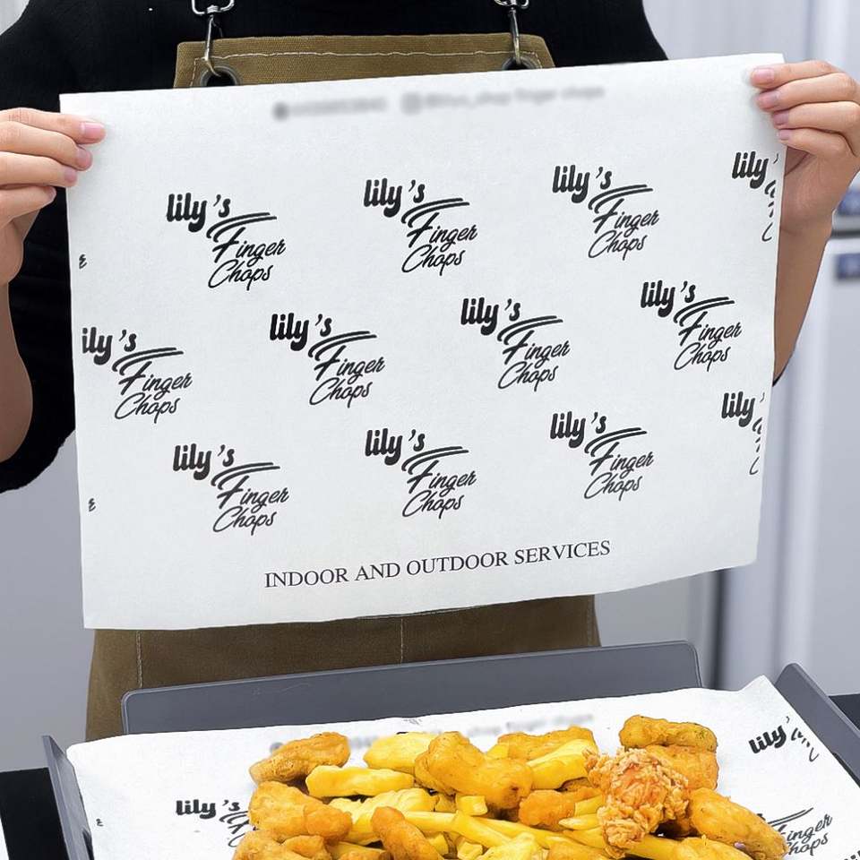 กระดาษห่ออาหารเคลือบ PE กันไขมัน เกรดอาหาร สำหรับบรรจุภัณฑ์แฮมเบอร์เกอร์ แซนวิช พิซซ่า และขนมขบเคี้ยว พร้อมโลโก้ตามสั่ง