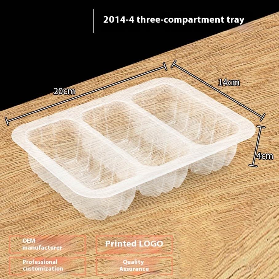 กล่องบรรจุอาหารแบบสามช่อง ปี 2014 ผลิตจากพลาสติก PP รีไซเคิลได้ สำหรับใส่ก๋วยเตี๋ยวแบบนำกลับบ้าน หนา 0.6 มม. พร้อมฝาปิดผนึก