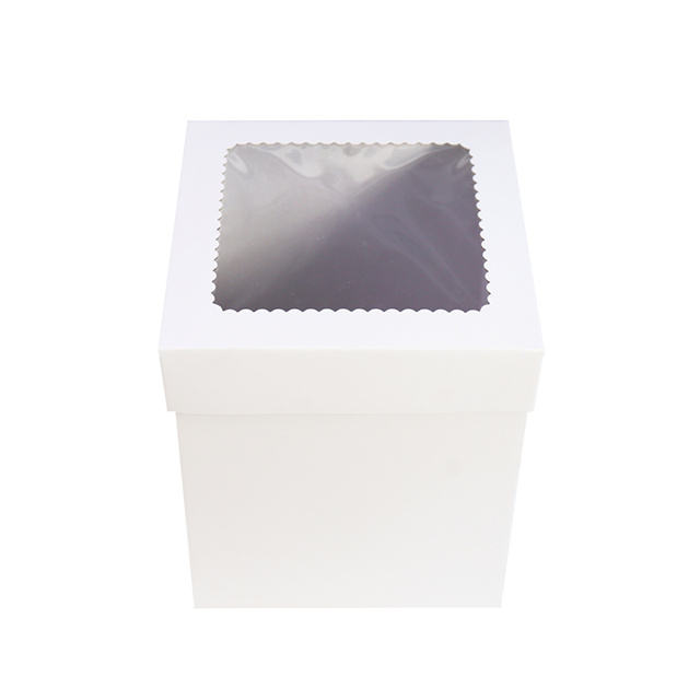 กล่องบรรจุภัณฑ์เค้กทรงสูงแบบพับได้ ทำจากกระดาษลูกฟูกเคลือบลามิเนตปลอดภัยสำหรับอาหาร พร้อมหน้าต่างมองเห็นได้และโครงสร้างที่แข็งแรงทนทาน